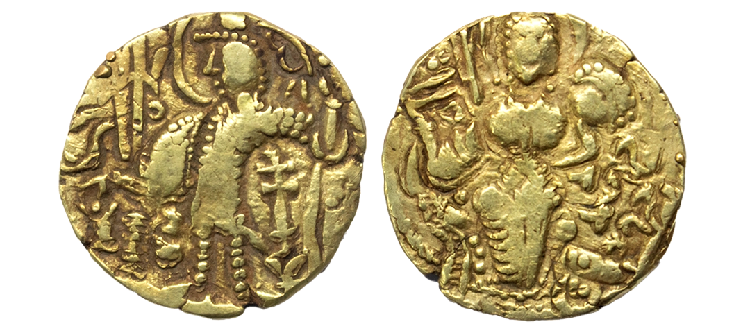 Ancient, Kidara Kushana issue, (c.300 AD), Base Gold Dinar, 7.81 gms, Obv: Standing king offering to fire altar, Brahmi legend below his left arm reading “Ki(dara)”, Rev: Seated deity Ardoksho with Carnucopia and Diadem in hand, very fine, very scarce.