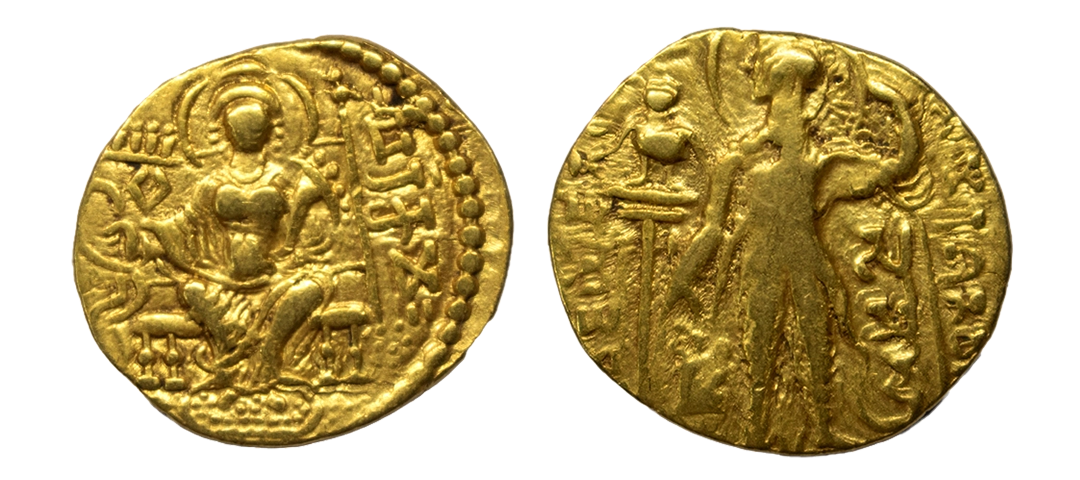 Ancient, Guptas, Samudragupta (335-380 AD), Javelin type, Gold Dinar, 7.47 gms, Obverse: King standing left, holding a Javelin and sacrificing at an altar, Garuda standard behind the altar, Traces of Brahmi legend around, Brahmi legend below hand reading as “Samudra”, Reverse: Seated goddess Adroksho/Lakshmi on throne, Holding Diadem and Cornucopia, Tamgah to left, Brahmi legend in right field reading as “Parakrama”, Shivlee # Class II p. 187, very fine, rare.