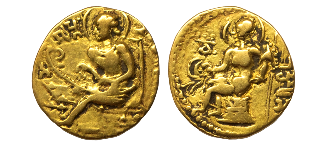 Guptas, Samudragupta (c. 335-380 AD), Gold Dinar, 7.68Grms, ‘Lyrist’ type, OBV: King seated on a high-backed throne, playing a veena (lute) with seven strings which is carrying on his lap, his left hand keeping the instrument in position and right hand manipulating strings of the instrument, king’s left leg hanging down while his right leg is folded on the conch and the toe of his right foot is touching the foot stool, Brahmi letter ’Si’ on footstool for siddham, around Brahmi legend ‘[Maharajadiraja sri Sa]mudraguptah’, REV: Goddess Lakshmi nimbate, seated left on a wicker stool, holding a diadem fillet in her right hand and a cornucopia in the left hand, tamgha on left field Brahmi legend ‘Samudraguptah’ in right margin. (Kumar # TOTGE var. B).