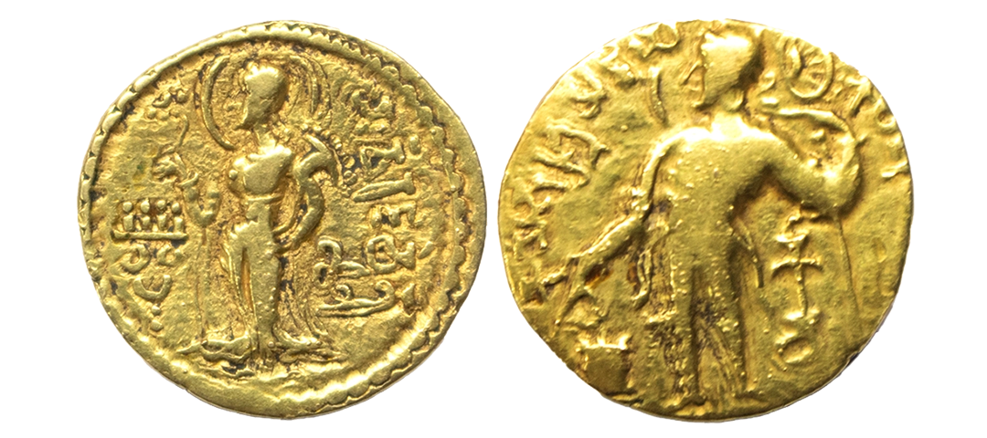 Ancient, Gupta Dynasty, Kacha Gupta (Circa 335 AD), Gold Dinar, 7.43 gms, Obverse: King standing with head turned left and right hand offering at fire altar, Left hand holding a Chakradhwaja, Brahmi legend ‘KaCha’ below his left hand, Brahmi legend around reading clockwise partially as ‘Kacho gam Avajitaya Dyam Karamabhir Uttamair Jayati’, Reverse: Standing goddess holding Cornucopia and a flower, Brahmi legend in right field ‘Sarvarajochhetta’ ie. ‘Exterminator of king’, Shivlee Class I, p 226, very fine, very rare.