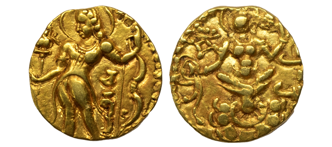 Ancient, Guptas, Chandragupta II (375-415 AD), Archer type, Gold Dinara, 7.83 gms, Obverse: King standing with his right arm outstretched holding an arrow, Garuda standard behind right arm, his left arm is holding a bow, Brahmi legend ‘Chandra’ below left arm, Reverse: Goddess Lakshmi (Ardoksho) seated facing on a lotus, holding a diadem in her right arm and a lotus stalk in her left arm. Brahmi legend ‘Shri Vikramah‘ in right field, S. Gupta, TOTGE # pg. 240, Archer Type, Class III, very fine+, rare.