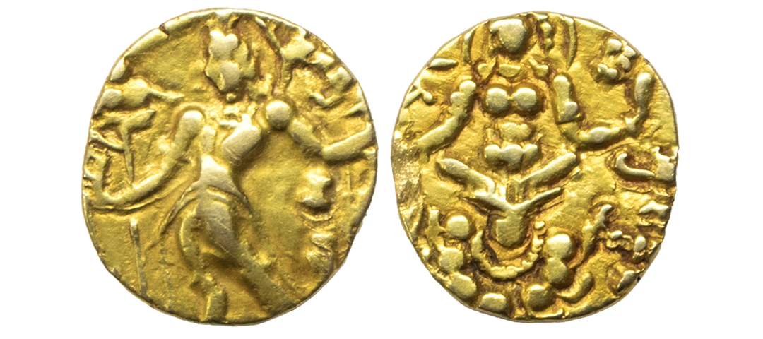 Ancient, Guptas, Chandragupta II (375-415 AD), Archer type, Gold Dinara, 8.07 gms, Obverse: King standing with his right arm outstretched holding an arrow, Garuda standard behind right arm, his left arm is holding a bow, Brahmi legend ‘Chandra’ below left arm, Reverse: Goddess Lakshmi seated facing on a lotus, holding a diadem in her right arm and a lotus stalk in her left arm. Brahmi legend ‘Shri Vikramah‘ in right field, S. Gupta, TOTGE # pg. 240, Archer Type, Class III, very fine+, very rare.