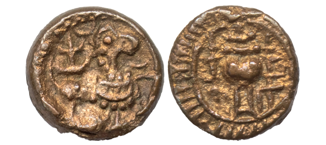 Vishnukundin Dynasty (c. 450-550 AD), Andhra Region, Copper Base Alloy, OBV: Roaring Lion walking to right upraised paw, srivatsa symbol on its back, REV: Conch shell flanked by two tridents within a rayed circular border. (Pieper # 2985). Fine+.