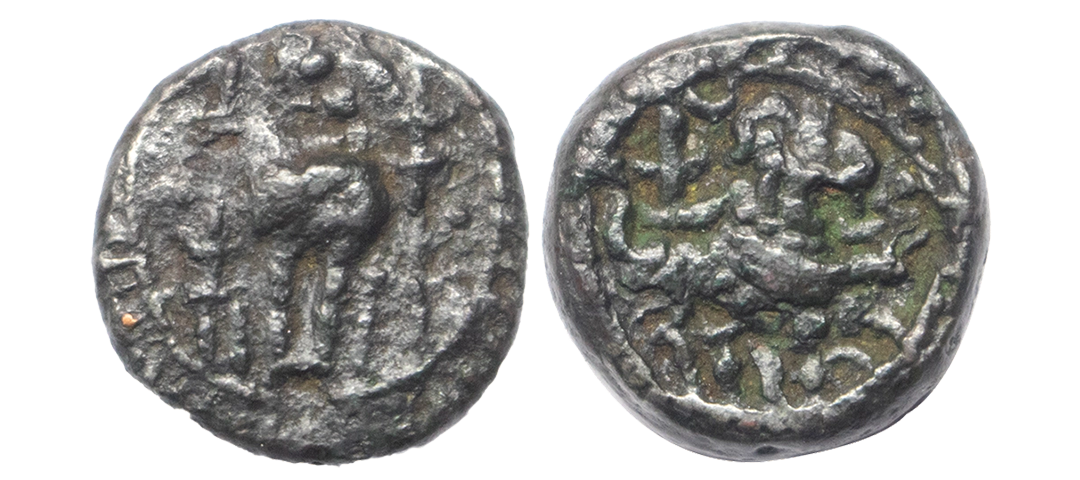 Vishnukundin Dynasty (c. 450-600 AD), Andhra Region, Copper Base Alloy, 6.61Grms, OBV: Roaring lion walking to right paw upraised, srivatsa and crescent symbol on its back, REV: Conch shell flanked by two tridents. (Pieper # 2985). Fine+.