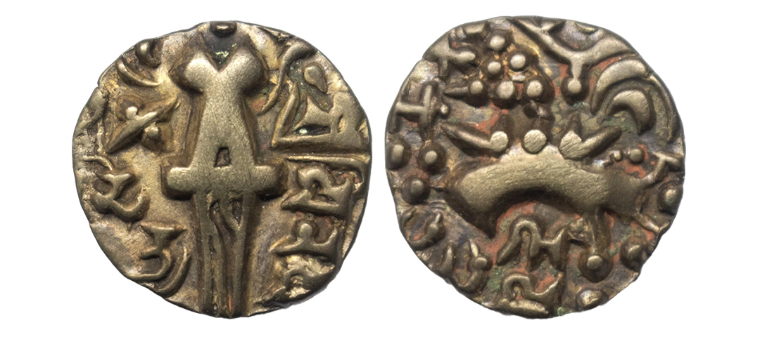 Kashmir-Karkota or Naga Dynasty of the Post-Gupta period, base gold dinar of King Vinayaditya, 7.63g. Obv: Crude representation of Kushan style king offering sacrifice; Brahmi legend under the arm. Rev: Crude representation of goddess seated on throne; Brahmi legend Sri Vinaya in right field.Very fine, Rare.