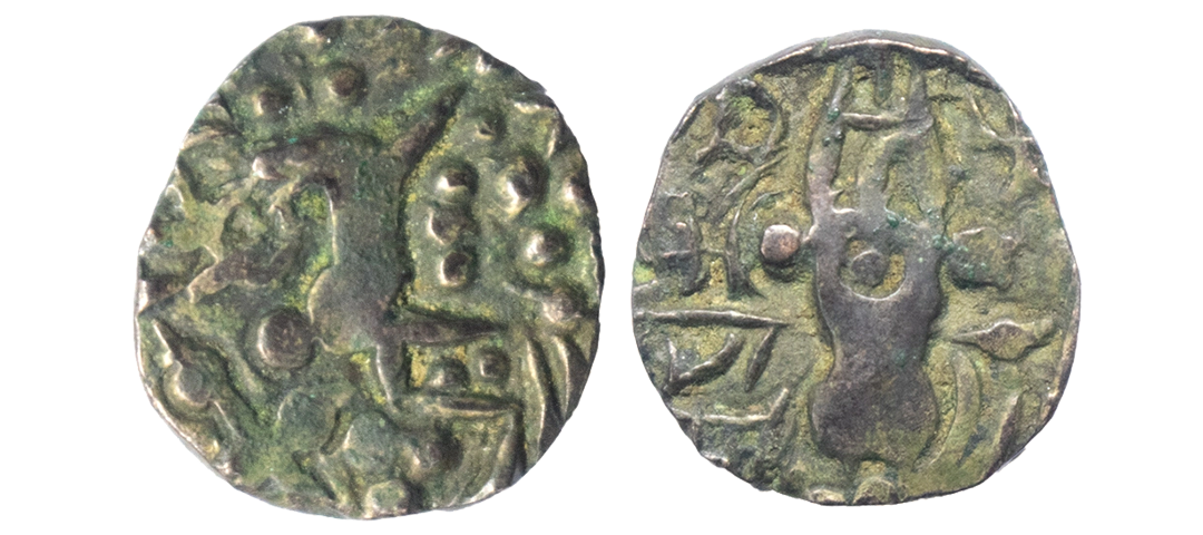 Ancient India, Kidaras of Kashmir, Pratapaditya II (5 Century AD), De-Base Gold Dinar, 7.63gm, Obv: highly stylized king standing facing at altar at left, Brahmi legend under arm "Kidara", Rev: Goddess Ardokhsho (Lakshmi) enthroned, Brahmi legend at right "Sri Pratapa", (MACW # 3641), very fine, scarce.
