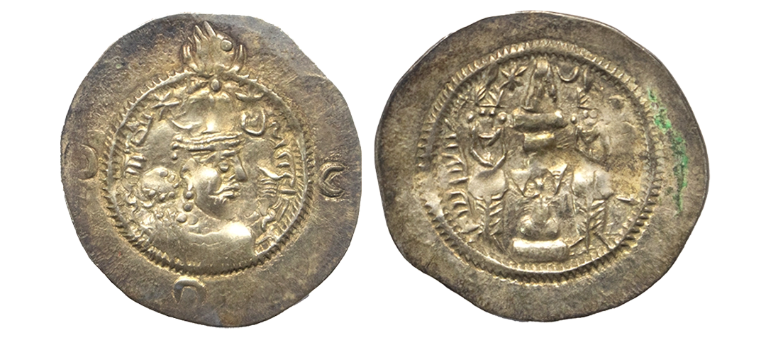 Ancient World, Sassanian Dynasty, Khusro I Anushirvan (531-579 CE), Silver Drachm, 4.14 gms, Obverse: Crowned Bust Facing Right of the king right star on left, star inside crescent right, empty crescents at 3, 6, and 9 o clock in the outer margin Reverse: Fire altar with two attendants on either side wearing crescent headdress, very fine, scarce.