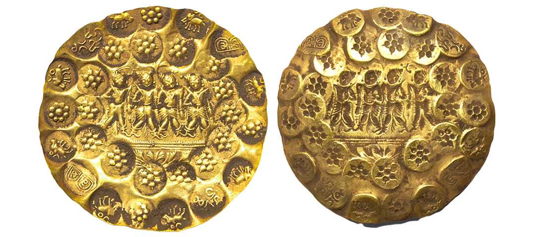 Kakatiyas of Warrangal, Prola-I (1052-1076 CE), Gold PMC, 9.99 gms , 4 -Warrior Type, 2 ½ Gold Gadyana. The broadest known Indian Hindu coin with total of 35 repousse punches on the obverse of a circular flan. Unpublished variety.Extra fine+, Exceedingly rare. The central punch consists of the images of Ram-Laxman-Bharat-Shatrughan in warrior pose. The other punches are struck in two concentric circular orbits. The inner orbit consists of 18 singly struck 8 petalled lotus punches as in a garland. The outer orbit punches consist of 2x Sri-Sri, 1x'Ahitagaja'and 1x'Kesari'in Kannada, and 4 groups of Boar-Lotus-Boar symbols interleaving the legend punches. The above coin is from a small hoard that had a mix of Nolamba, Ganga, and Kakatiya coins. The hoard is believed to be of the mint that changed hands of the Nolambas, Kakatiyas and the Gangas dynasties. 'Ahitagaja Kesari' is one of the common titles of the Kakatiyas adorned by many of the rulers of the dynasty starting from Prola-I. The coin fabric suggests that the coin is of period of transition between the Nolambas and the Kakatiyas. The above coin hence is assigned to Prola-I (1052-1076 CE).