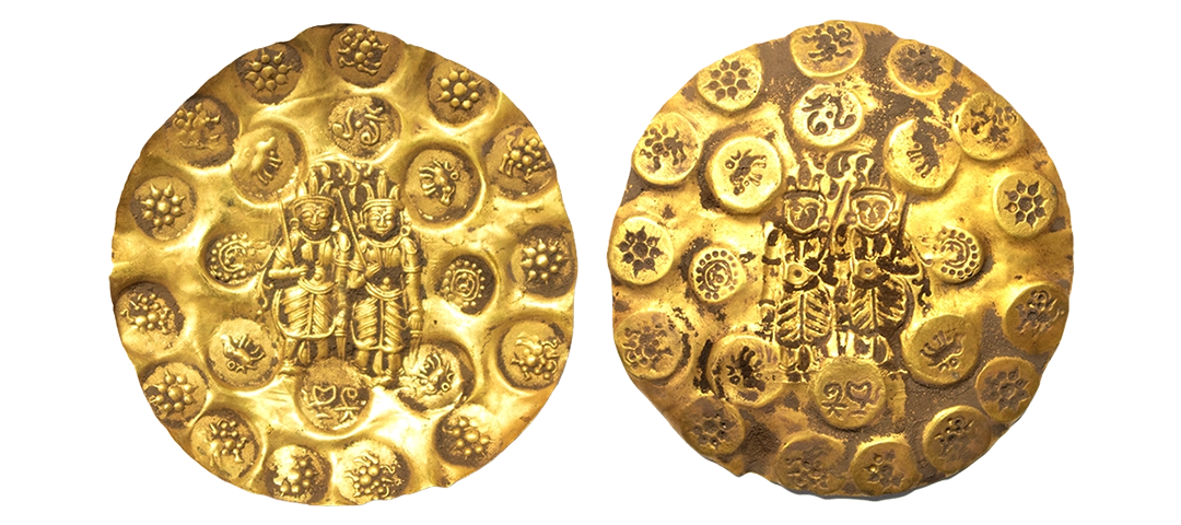 Kakatiyas of Warrangal, possibly the period of Prola I (1052-1076 CE), uniface gold PMC with 23 repousse punches, Two-and-half gold gadyana denomination, 9.42 gms, Obv: 1x central punch consisting of Rama-Lakshman standing facing front carrying a club in their right arms. 8x inner circle of punches surrounding the central punch consists of 2x Sri in Kannada, 1x Lenka in Kannada, 1x Koma in Kannada and then 4x Boar, the Kakatiya insignia as seen in the image. 14x peripheral circumfluent punches consisting of 7 petalled Lotus and 7 Lion facing left in sequence.Unpublished variety, Extremely fine, Exceedingly rare.