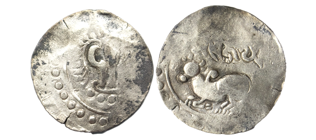 Chandra Kingdom of Harikela, Dharmavijaya (7th century AD), Silver Unit, 7.75Grms, OBV: A recumbent bull to left with tail hanging down, Brahmi legend Dharmmavijaya above, REV: usual Shrivatsa or tripartite symbol in the center with crescent and sun above (Bose & Nasir HA13.4).