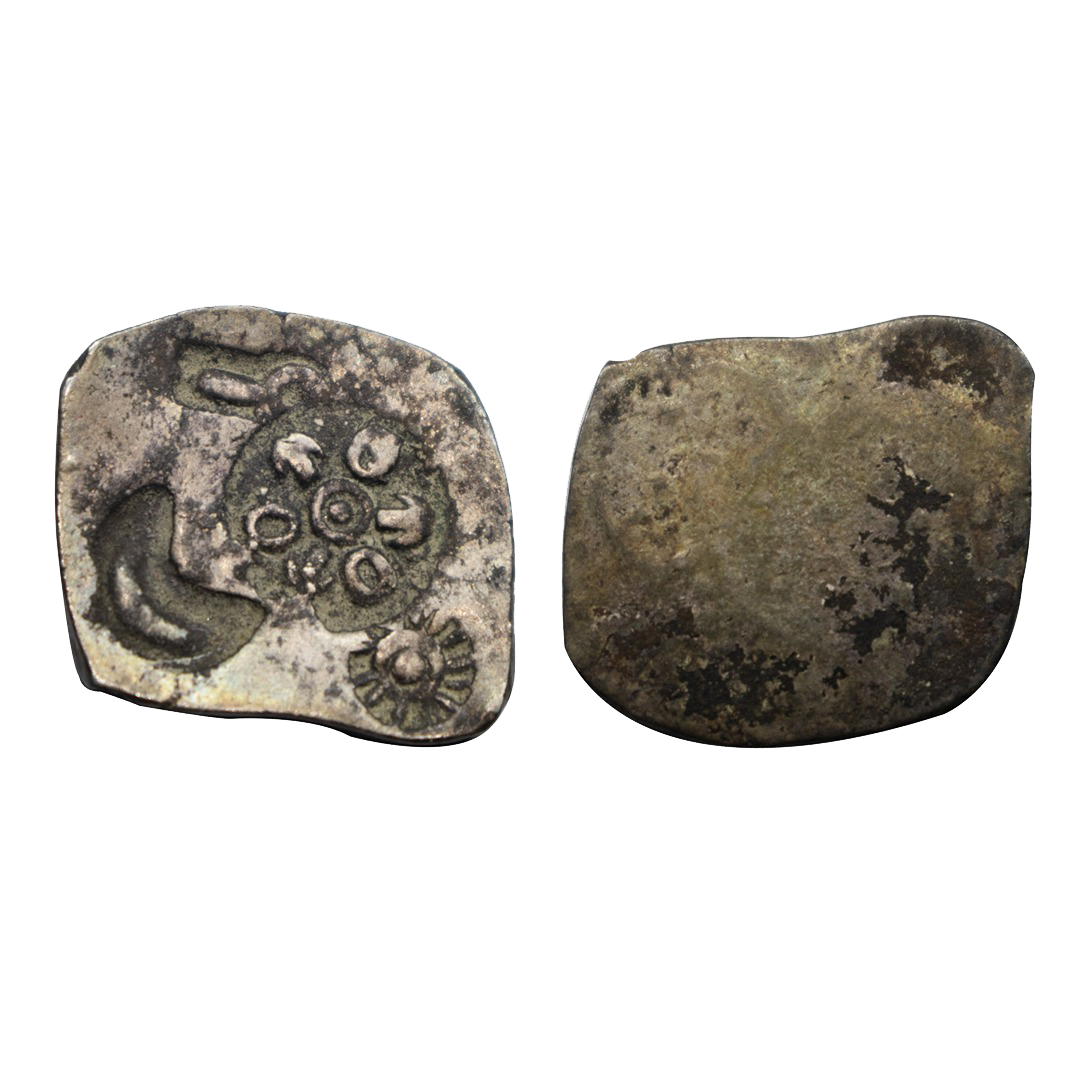 Archaic Coinage, Punch Marked, attributed to Magadha Mahajanapada (c. 600-400 BC.), Patna Region (Bihar), Silver Vimshatika, 5.25grms, G/H Series 0, five symbol type, OBV: Six armed in centre is main symbol around small symbol including, crescent, sun and other symbol, Unfiace. (Rajgor # Series 10). Very fine