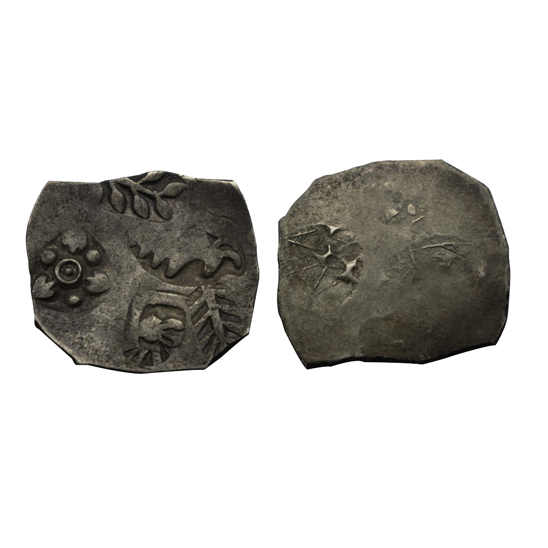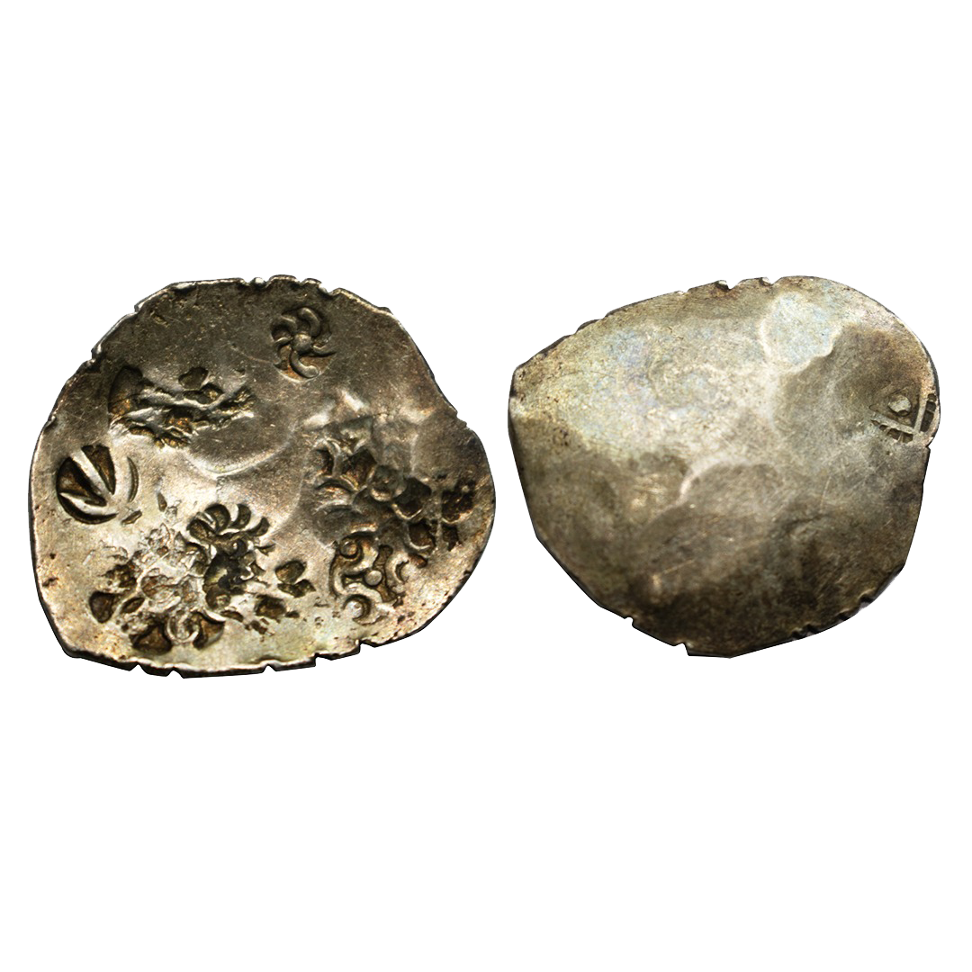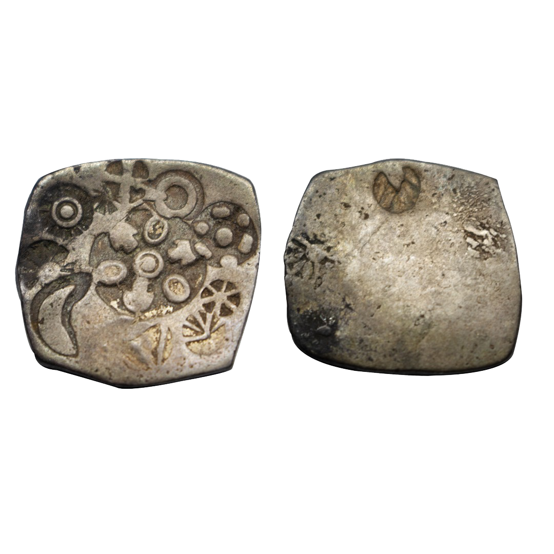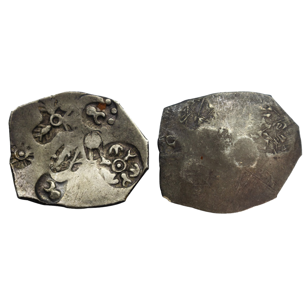Archaic Coinage, Punch Marked, attributed to Magadha Mahajanapada (c. 600-400 BC.), Patna Region (Bihar), Silver Vimshatika, 5.35grms, G/H Series 0, five symbol type, OBV: Six armed in centre is main symbol around small symbol including, crescent, sun, dots cluster and other symbol, Rev: Various banker mark. (Rajgor # Series 10). Very fine