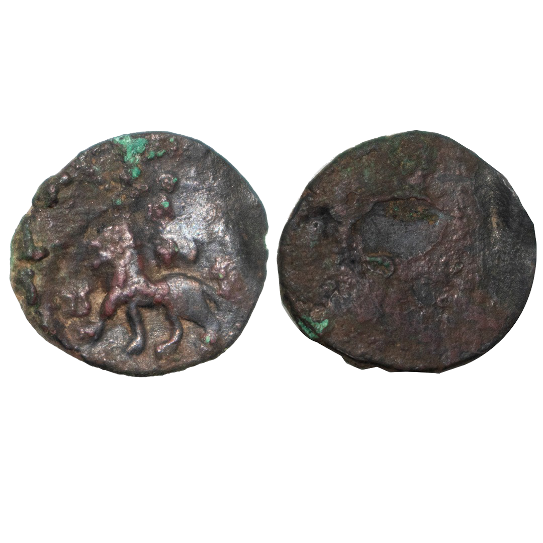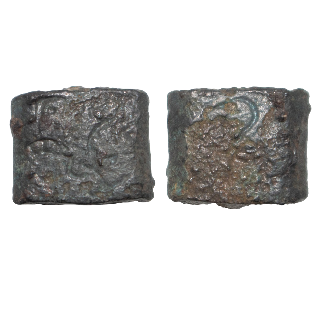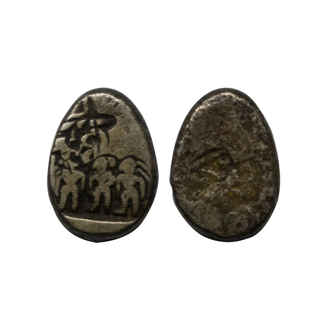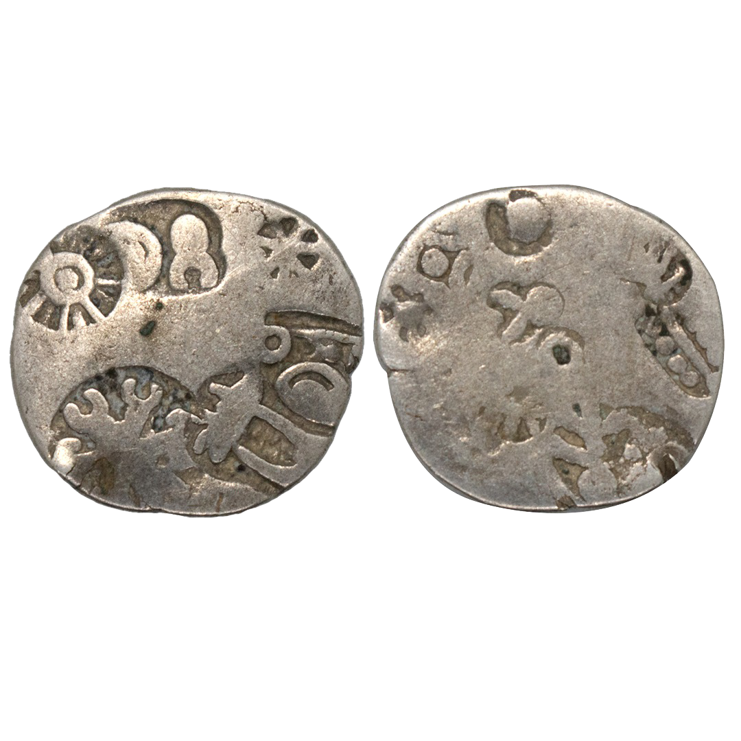 Punch Marked, Magadha Empire, Imperial Series, Silver Karshapana, 3.19grms, Obv: Three human figures from a single punch, peacock to top right on six arched hill , balance symbol, Rev: Peacock on three arched hill. Some scholars attribute the three human figure representation to Rama, Sita and Lakshmana. G/H Series VII (Var. 590). Very fine