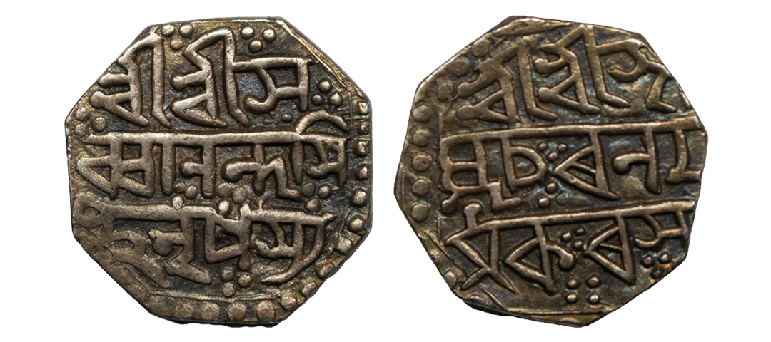 Assam, Gaurinatha Singa (SE 1702-1718 / 1780-1796 AD), Silver 1/2 Rupee, 5.48grms, Year 16, Assamese legends on both sides, OBV: Sri Sri Ha/ra Gauri Pa/da Parasya, REV: Sri Sri Gau/rinatha Sim/ha Nrpasya & year 16 at bottom. (A.Mitra # 383). extremely fine