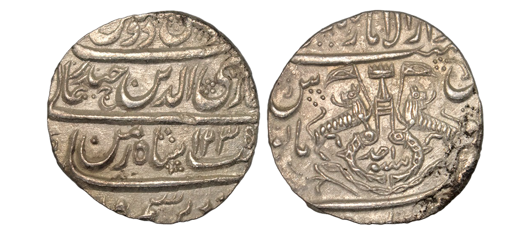 Princely States, Awadh, Saadat Ali Khan II, (AH 1212-1229 / 1798-1814 AD). Silver Rupee, 11.09grms, Muhammadabad Banaras Mint, AH 1221, fronzen RY 26, in the name of Shah Alam II, Fish and pataka on rev. (KM # 130.2).very fine