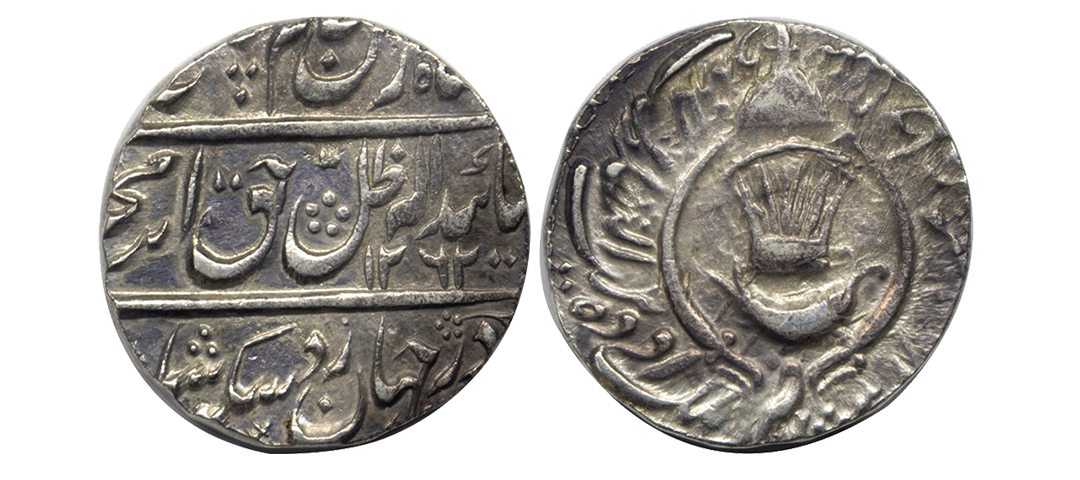 Princely States, Awadh, Saadat Ali Khan II (AH1212-1229 / 1798-1814 AD) Silver Rupee, 10.90grms, Muhammadabad Banaras Mint, in the name Shah Alam II, AH 1216, frozen RY 26, Fish, pataka and flower mark on rev. (KM # 103.2).very fine