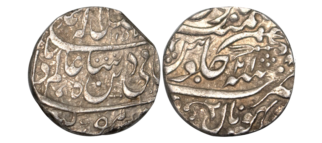 Princely States, Bharatpur, Randhir Singh (AH 1220-1239; 1805-1823 AD), Silver Rupee, 11.05grms, Brajinderpur Mint, RY 11, in the name of Akbar II, Star mint mark on rev. (KM # 136). Extremely fine