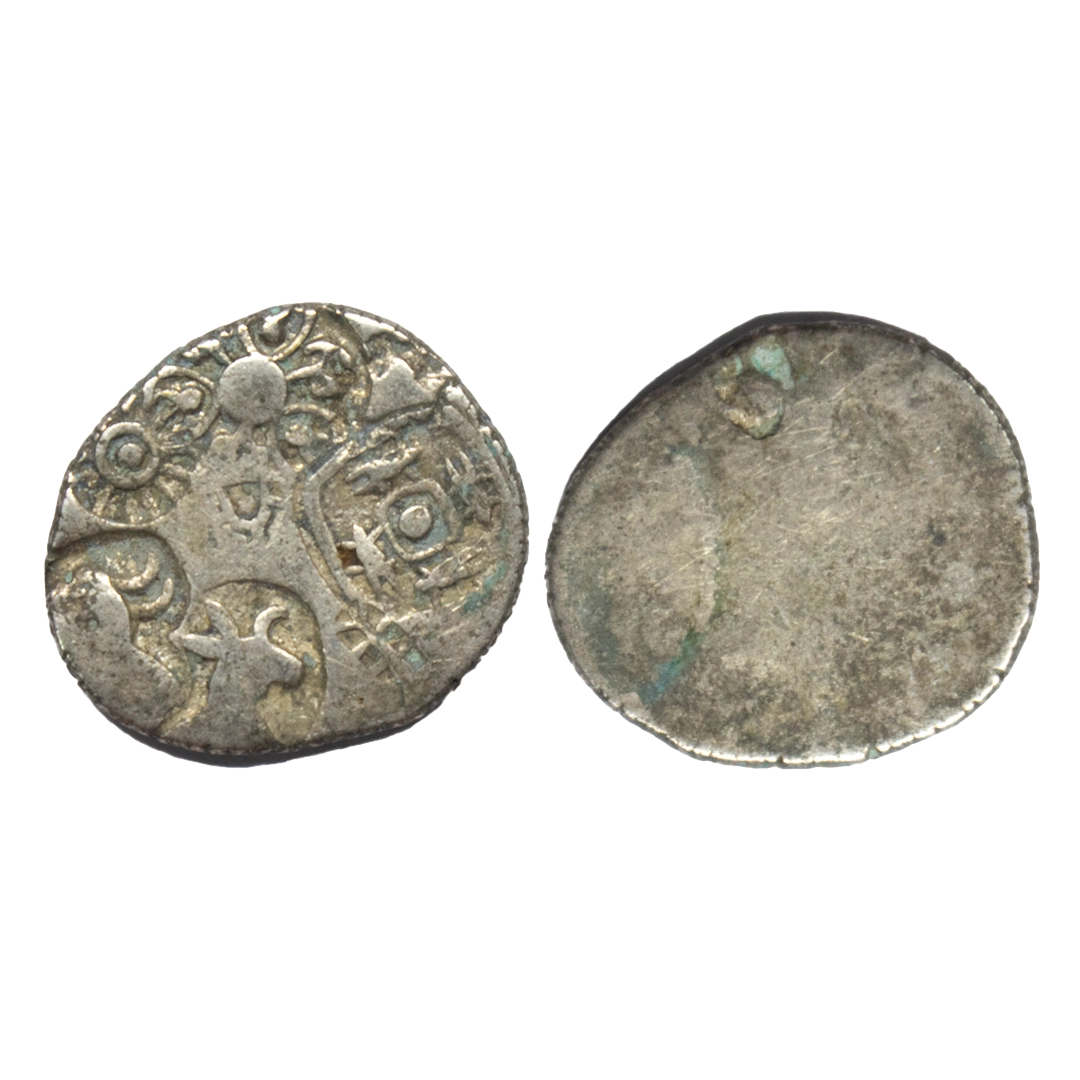 Archaic Coinage, Punch Marked, Imperial Magadha (c. 400-350 BC), Silver Karshapana, G/H series III, five symbol type, OBV: Sun, six armed, bull, elephant and four fishes surrounding square frame, Uniface. (Gupta & Hardaker # 319). Very Fine+.