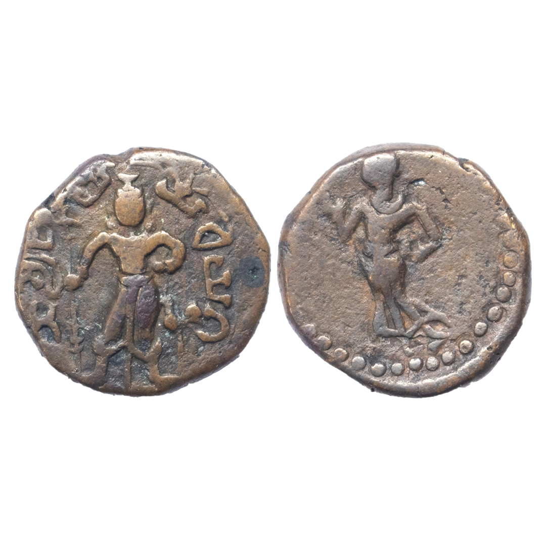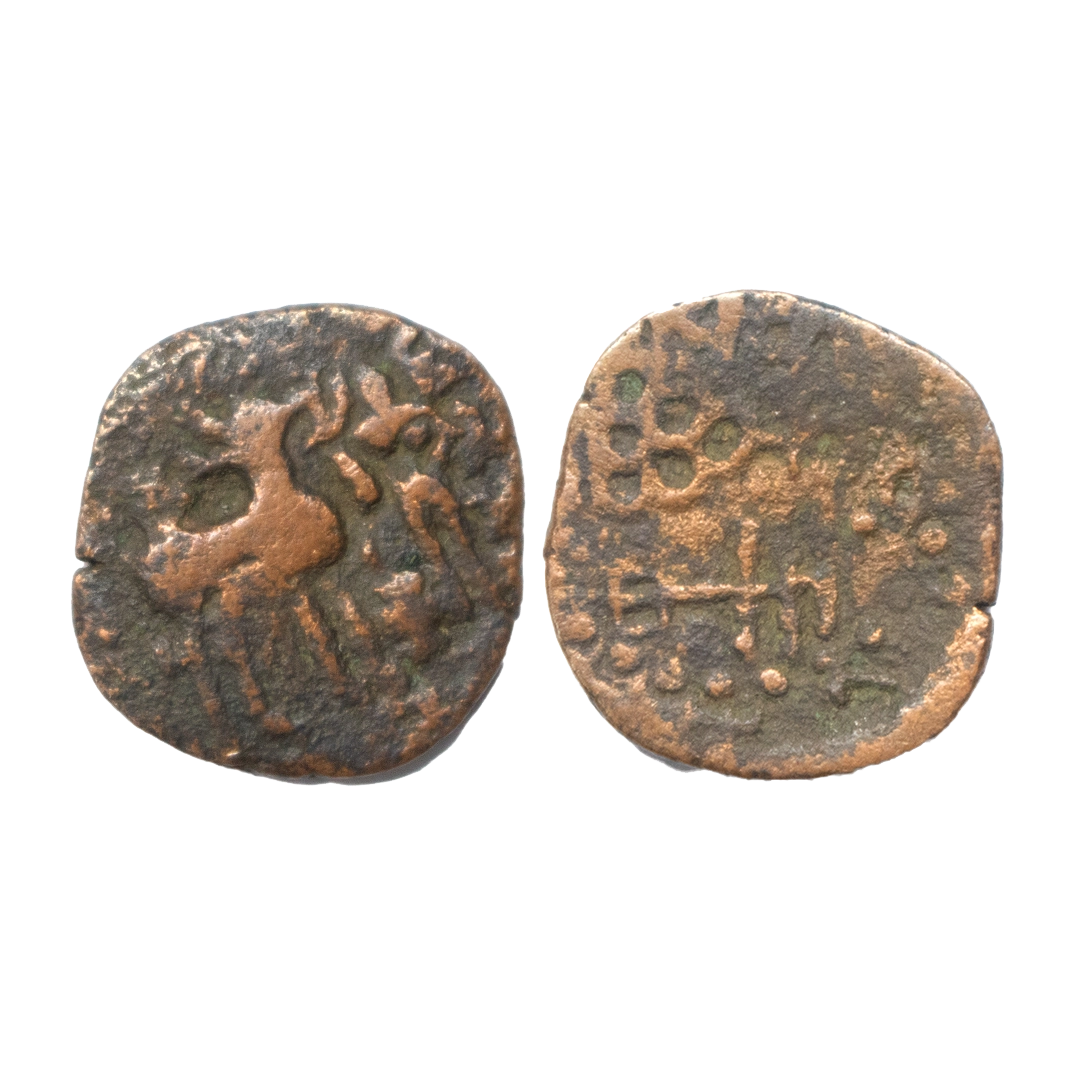 Kunindas, Amoghabhuti (c. 200 BC), Silver Drachma, 2.21Grms, Srivatsa or Fire altar under Deer Type, OBV: Deer standing to right srivatsa and rectangular vase above, Srivatsa or Fire altar between deer legs and above parasol, goddess standing on beaded lotus flower, holding a flower, around Brahmi legend, 'Rajnya Kunindasa Amoghabhutisa Maharajasa’, REV: Six arched hill above nandipada below river symbol, tree-in-railing, indradhavaja above svastika and around Kharoshthi legend 'Maharaja Amoghabhutisa’. Very Fine.