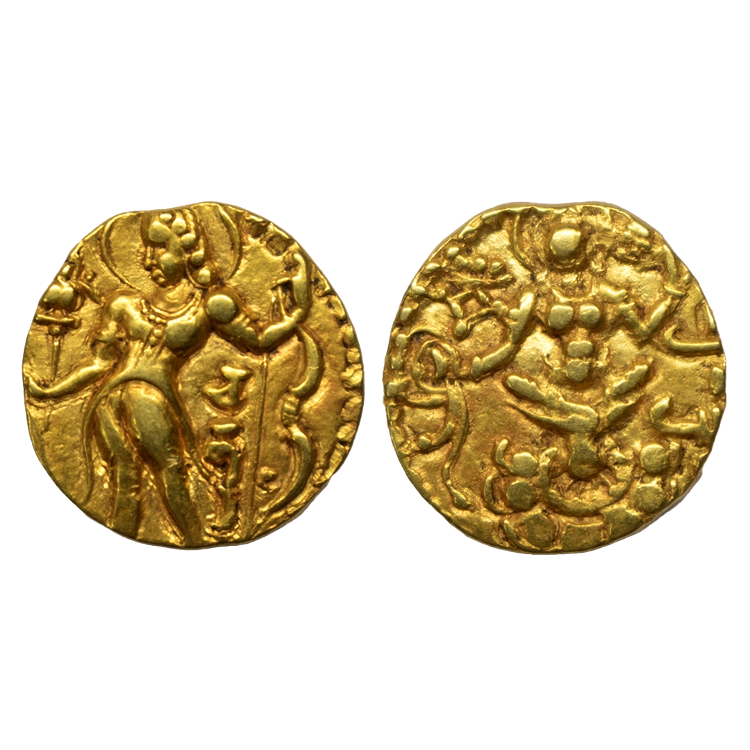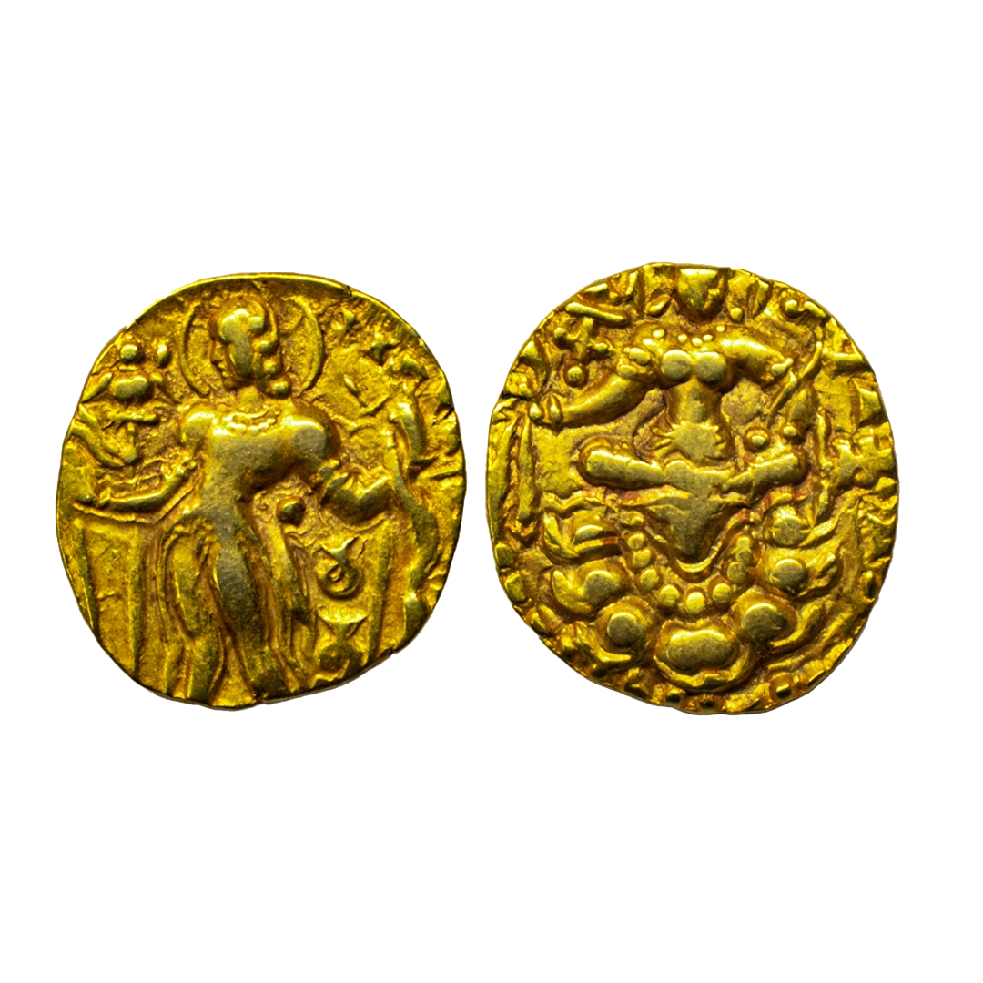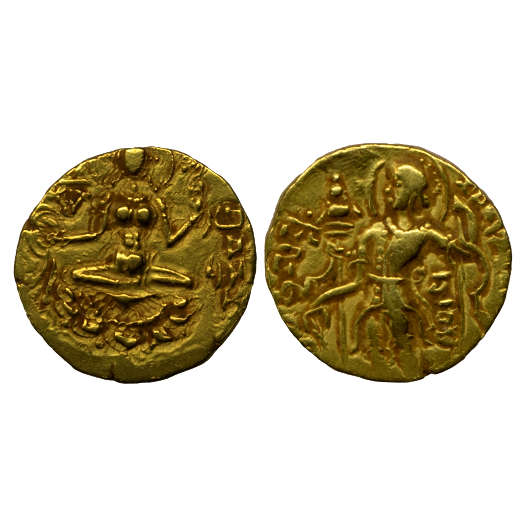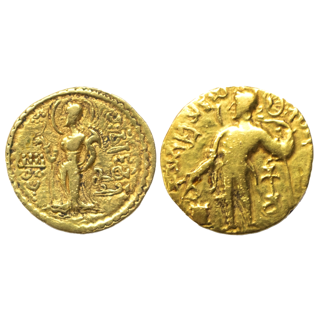 Ancient, Gupta Dynasty, Kacha Gupta (Circa 335 AD), Gold Dinar, 7.43 gms, Obverse: King standing with head turned left and right hand offering at fire altar, Left hand holding a Chakradhwaja, Brahmi legend ‘KaCha’ below his left hand, Brahmi legend around reading clockwise partially as ‘Kacho gam Avajitaya Dyam Karamabhir Uttamair Jayati’, Reverse: Standing goddess holding Cornucopia and a flower, Brahmi legend in right field ‘Sarvarajochhetta’ ie. ‘Exterminator of king’, Shivlee Class I, p 226, very fine, very rare.