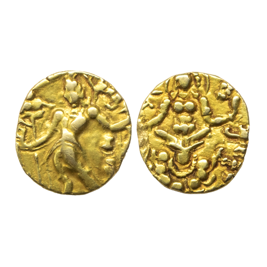 Ancient, Guptas, Chandragupta II (375-415 AD), Archer type, Gold Dinara, 8.07 gms, Obverse: King standing with his right arm outstretched holding an arrow, Garuda standard behind right arm, his left arm is holding a bow, Brahmi legend ‘Chandra’ below left arm, Reverse: Goddess Lakshmi seated facing on a lotus, holding a diadem in her right arm and a lotus stalk in her left arm. Brahmi legend ‘Shri Vikramah‘ in right field, S. Gupta, TOTGE # pg. 240, Archer Type, Class III, very fine+, very rare.