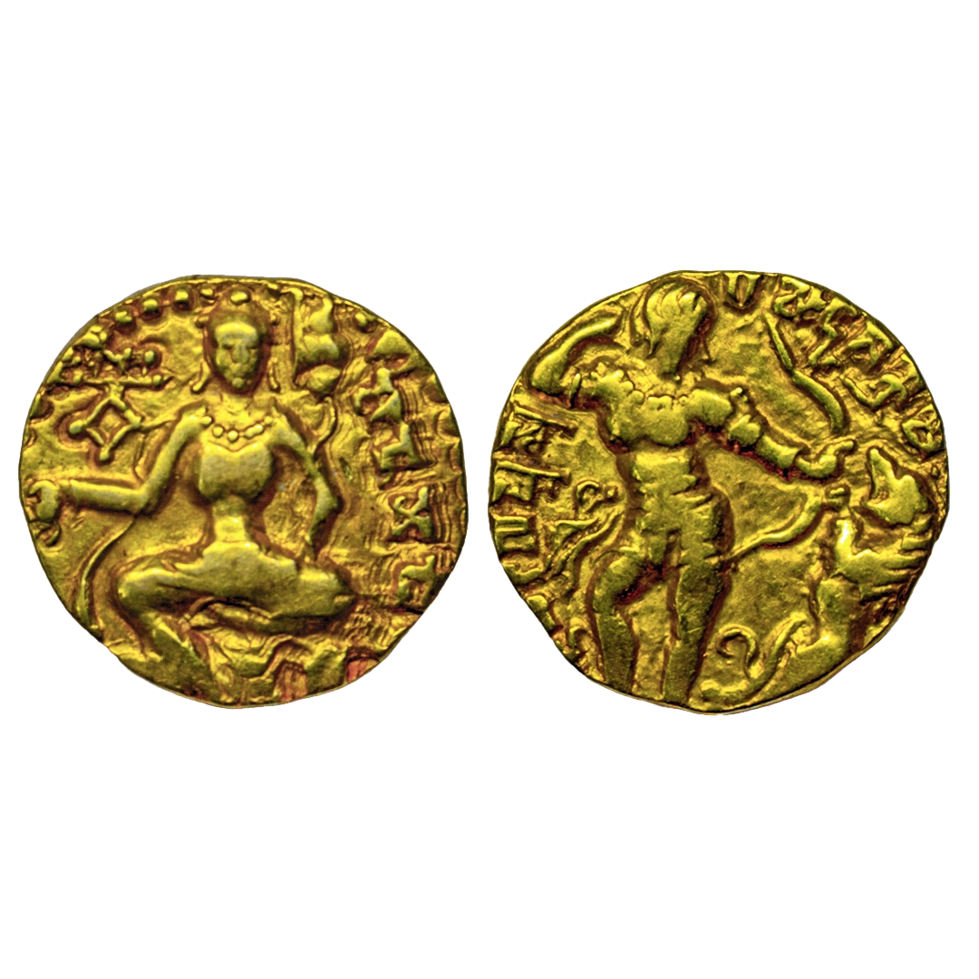 Ancient, Guptas, Chandragupta II (375-415 AD), Archer type, Gold Dinara, 8.07 gms, Obverse: King standing with his right arm outstretched holding an arrow, Garuda standard behind right arm, his left arm is holding a bow, Brahmi legend ‘Chandra’ below left arm, Reverse: Goddess Lakshmi seated facing on a lotus, holding a diadem in her right arm and a lotus stalk in her left arm. Brahmi legend ‘Shri Vikramah‘ in right field, S. Gupta, TOTGE # pg. 240, Archer Type, Class III, very fine+, very rare.