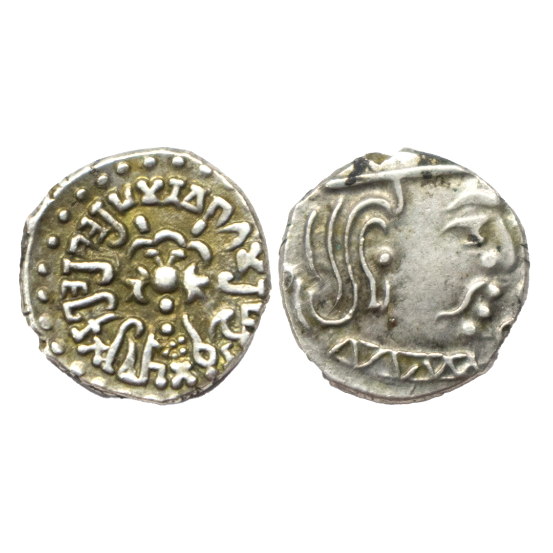Ancient, Guptas, Chandragupta II (375-415 AD), Archer type, Gold Dinara, 8.07 gms, Obverse: King standing with his right arm outstretched holding an arrow, Garuda standard behind right arm, his left arm is holding a bow, Brahmi legend ‘Chandra’ below left arm, Reverse: Goddess Lakshmi seated facing on a lotus, holding a diadem in her right arm and a lotus stalk in her left arm. Brahmi legend ‘Shri Vikramah‘ in right field, S. Gupta, TOTGE # pg. 240, Archer Type, Class III, very fine+, very rare.