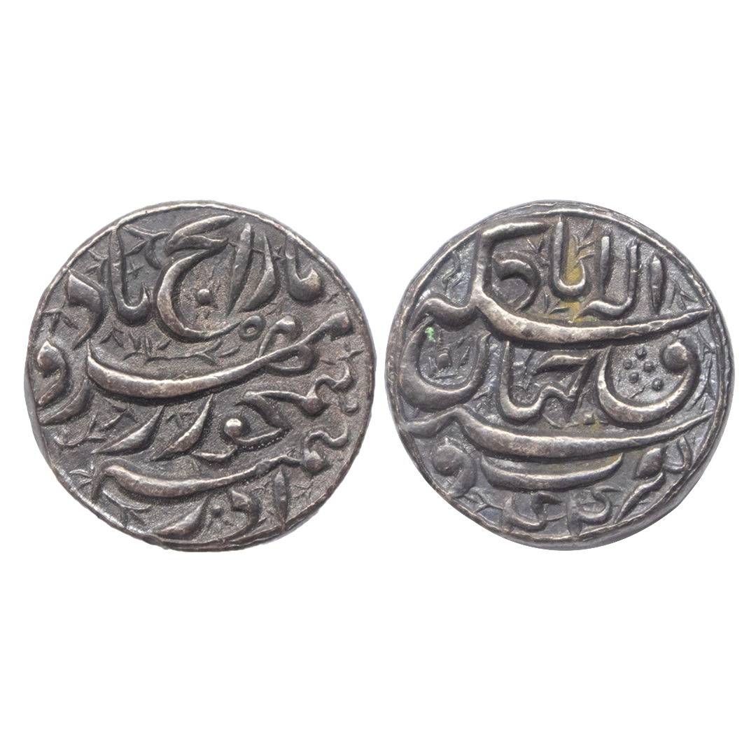 Mughal, Akbar (AH 963-1014, 1556-1605 AD), Silver Rupee, 11.40 gms, Rebellion Issue of Jahangir, Allahabad Mint, “Bagharb -O- Sharq” couplet, Ilahi Month Azar, RY 44, KM # 97.1, coin bearing Ilahi month and RY are rarer than the normal ones, extra fine, rare. Big Flan, with almost complete die impressions on both sides.