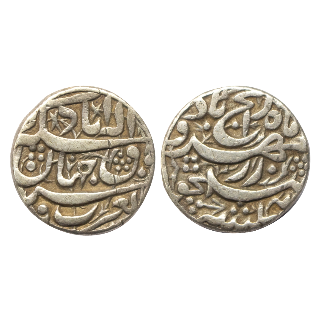 Mughal, Akbar (AH 963-1014, 1556-1605 AD), Silver Rupee, 11.40 gms, Rebellion Issue of Jahangir, Allahabad Mint, “Bagharb -O- Sharq” couplet, Ilahi Month Azar, RY 44, KM # 97.1, coin bearing Ilahi month and RY are rarer than the normal ones, extra fine, rare. Big Flan, with almost complete die impressions on both sides.