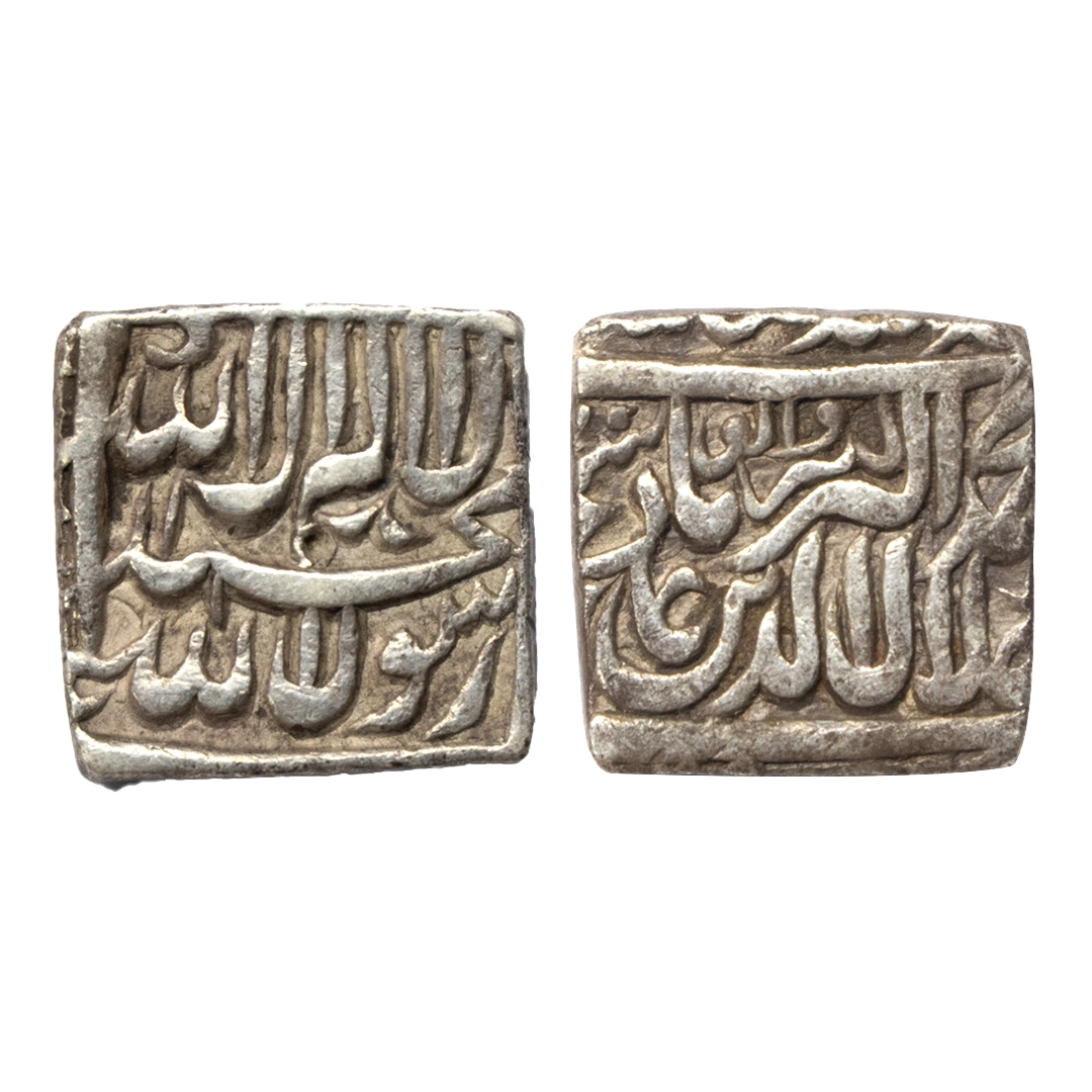 Mughal, Akbar (AH 963-1014, 1556-1605 AD), Silver Rupee, 11.40 gms, Rebellion Issue of Jahangir, Allahabad Mint, “Bagharb -O- Sharq” couplet, Ilahi Month Azar, RY 44, KM # 97.1, coin bearing Ilahi month and RY are rarer than the normal ones, extra fine, rare. Big Flan, with almost complete die impressions on both sides.