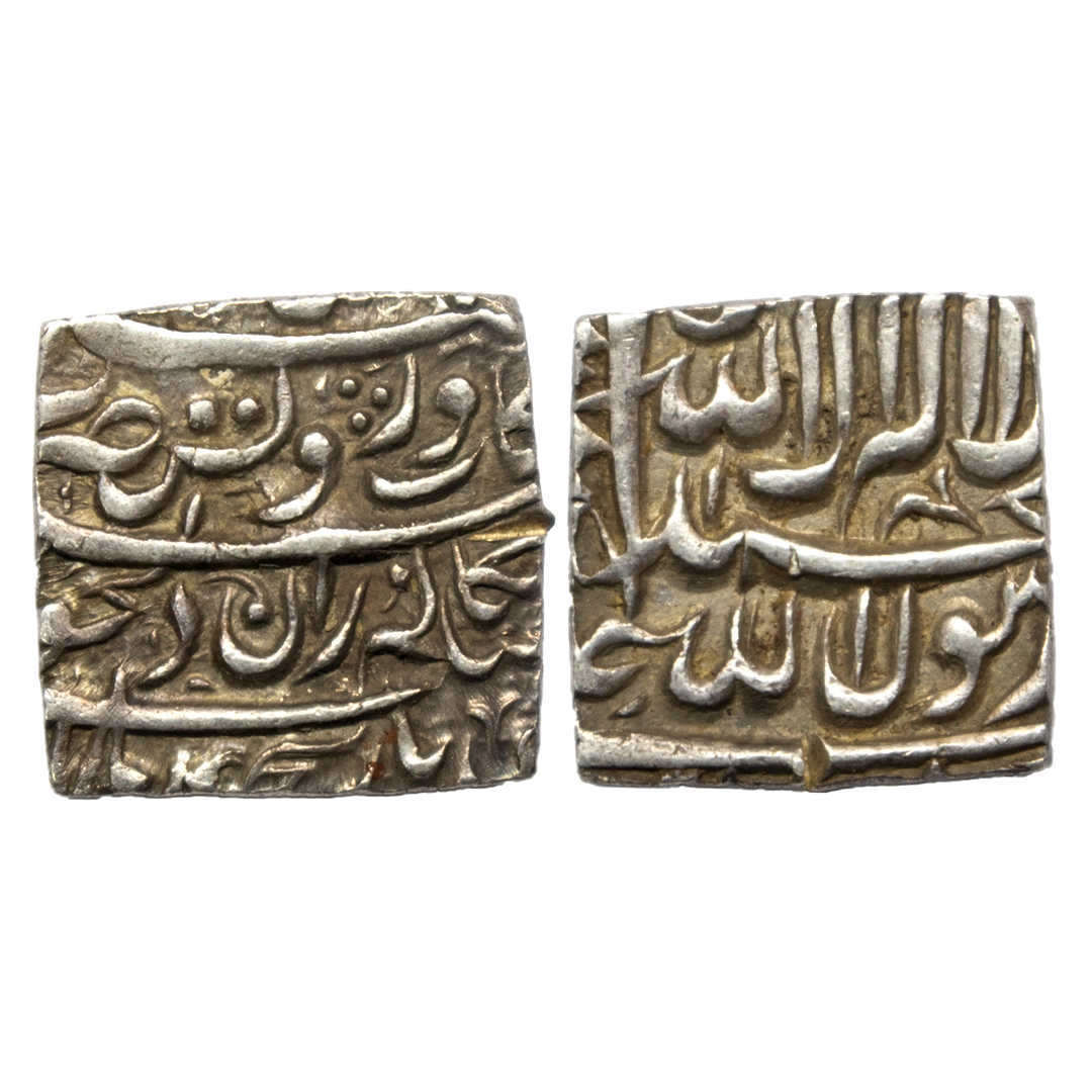 Mughals, Akbar (AH 963-1014 / 1556-1605 AD), Silver Square Rupee, 11.40Grms, Bangala Mint, OBV: Kalima, REV: Poetic couplet read as ‘Sikka-e-Bangala zan dilkhwah shud, Kaab-e-Roshan zarb Akbar Shah shud’. (KM # 86.1).