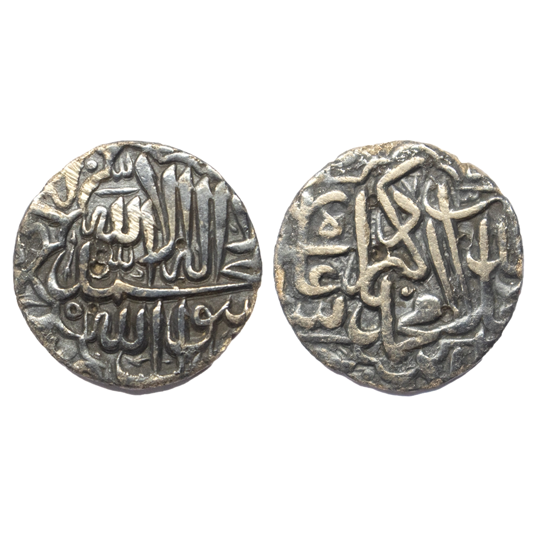 Mughals, Akbar (AH 963-1014 / 1556-1605 AD), Silver Square Rupee, 11.40Grms, Bangala Mint, OBV: Kalima, REV: Poetic couplet read as ‘Sikka-e-Bangala zan dilkhwah shud, Kaab-e-Roshan zarb Akbar Shah shud’. (KM # 86.1).