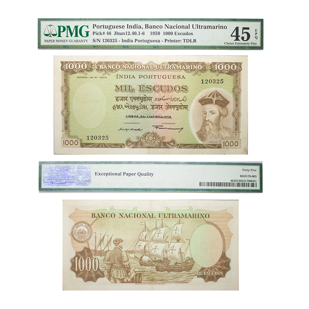 Indo-Portuguese Territories, 1000 Escudos, 7th Issue, dated 2nd January 1959, signed by Francisco Jose Vieira Machado as Governor and Abel Beja Corte Real as Administrator, Serial No.: 120325, Printed by Thomas de la Rue, London, J&R 12.40.6. Graded as Choice extremely fine 45 by PMG, Very Rare in this Grade.