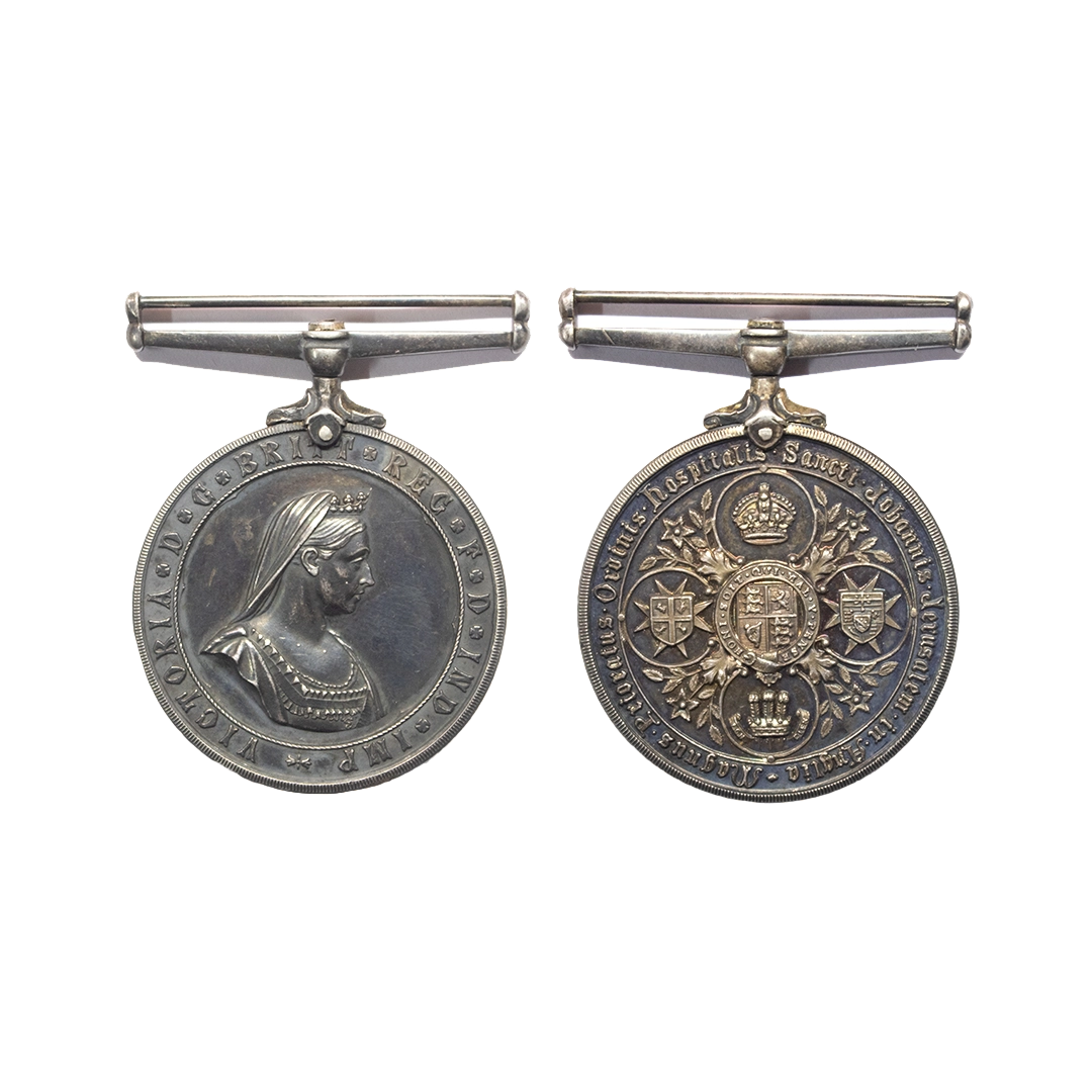 British India, Victoria Silver Medal, 34.92 gms, Service Medal of the order of St. John. The most venerable order of the hospital of St. John of Jerusalem (AD 1898 - 1947), Awarded to R. M. D. Banda, AD 1941.