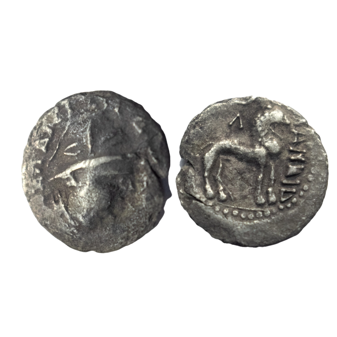 Ancient India, Kushanas, Yueh-Chi Dynasty, Sapalbizes (c. 20-1 BC), Silver Hemidrachm, 1.21Grms, Obv: Helmeted bust if king facing to right behind Greek legend ‘CAPALBIZHC’, Rev: Lion standing facing to right side with long neck, tamgha and Greek legend on both side ‘NANAIA’. (Jongeward, Cribb& Donovan # 1-2). Estimate
