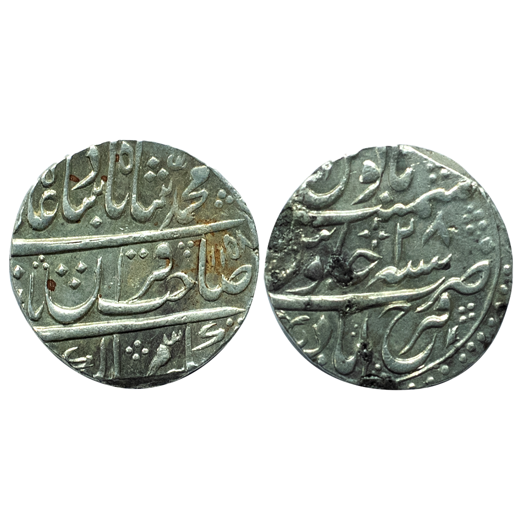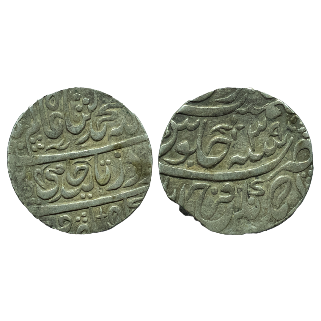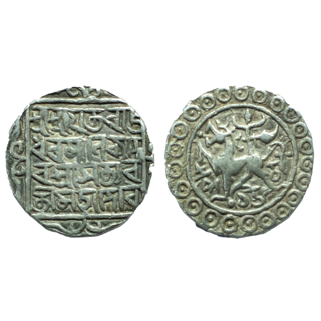 Independent Kingdom, Tripura, Rajadhara Manikya with Queen Satyavati Mahadevi (SE 1508-1531 / 1586-1599 AD), Silver Tanka, 10.70Grms, SE 1508, OBV: lion to left with a standard above, flag tied to shaft, with date Saka 1508 below, within circle, outer border of circles with central pellet & samall pellet added to left of standard, REV: Sri Sri Yuta Raja/dhara Manikya/Deva Sri Satyava/ti Maha Devyau in four lines within square. (R&B # 185 type). Extremely Fine, Big flan, Rare.