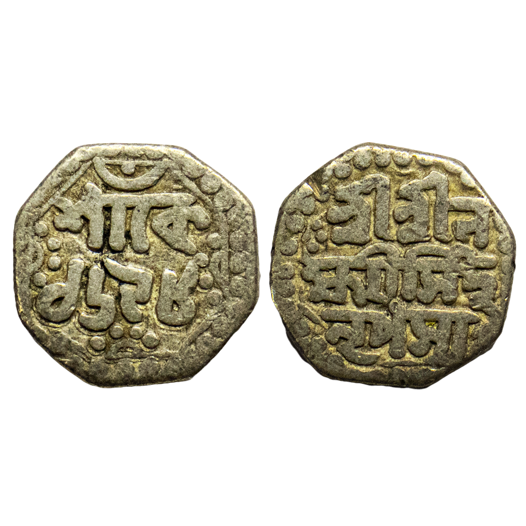 IK, Assam, Rajesvara Simha (1751-1769 AD), silver rupee, sake 1675, Devnagri Legend instead of usual Bengali/Assamese Legend, R&B O82.1, 11.46g. Obv: Nagari legend Sri Sri Mahe/svari Charana Ka/mala Makaranda Ma/dhukarasya, below lion facing to left. Rev: Nagari legend Sri Sri Svarga/Deva Sri Rajesva/ra Simha NrPasya/sake 1675. Extremely fine+, Very rare.