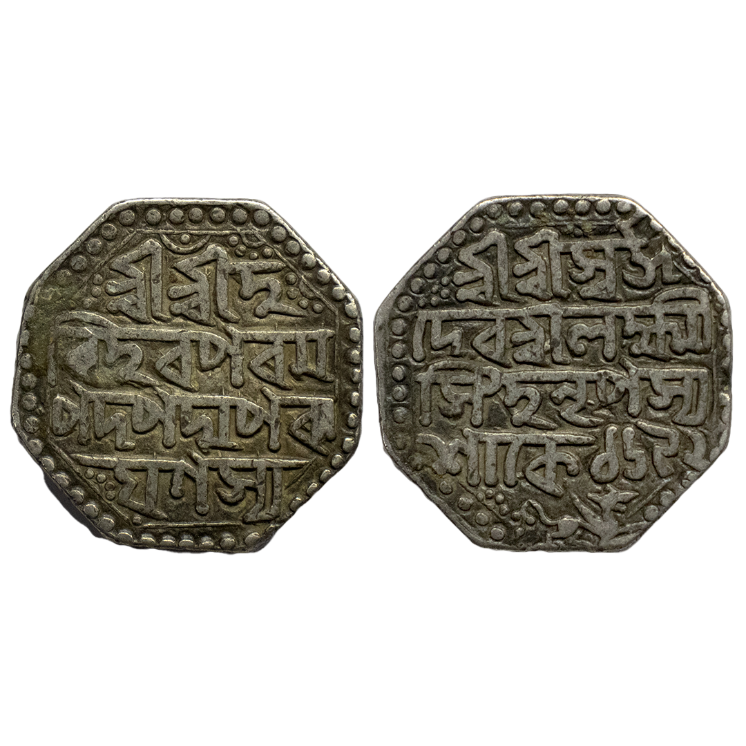 IK, Assam, Rajesvara Simha (1751-1769 AD), silver rupee, sake 1675, Devnagri Legend instead of usual Bengali/Assamese Legend, R&B O82.1, 11.46g. Obv: Nagari legend Sri Sri Mahe/svari Charana Ka/mala Makaranda Ma/dhukarasya, below lion facing to left. Rev: Nagari legend Sri Sri Svarga/Deva Sri Rajesva/ra Simha NrPasya/sake 1675. Extremely fine+, Very rare.