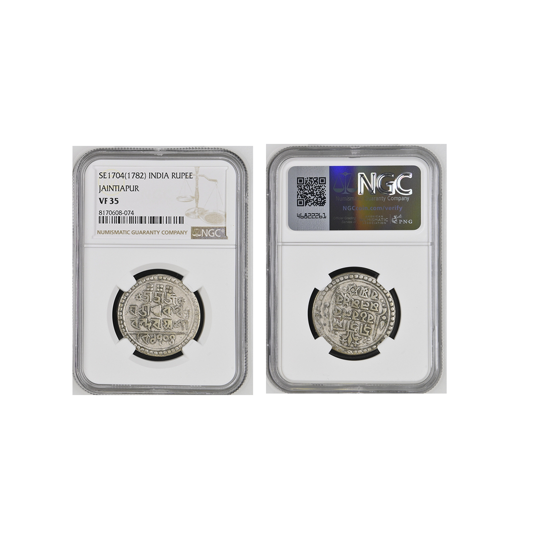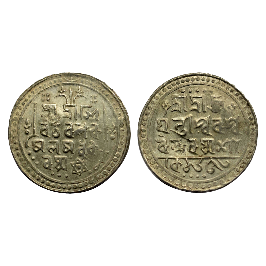 Independent Kingdoms, Cooch Behar, Harendra Narayan or Darendra Narayan (SE 1695-1761, 1773-1839 AD), Silver 1/2 Tanka, 4.81 gms, Obv: sri/sri/siva charana/kamala madhu/karasya, Rev: sri srima/t dharendra or harendra nara/yanasya sake, 4.53g, 18.19mm, S.K.Bose # M-1.10, about very fine.