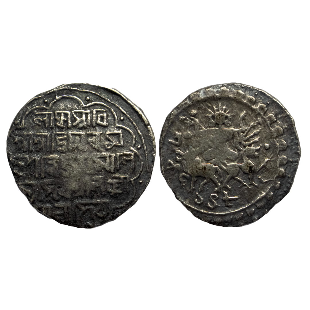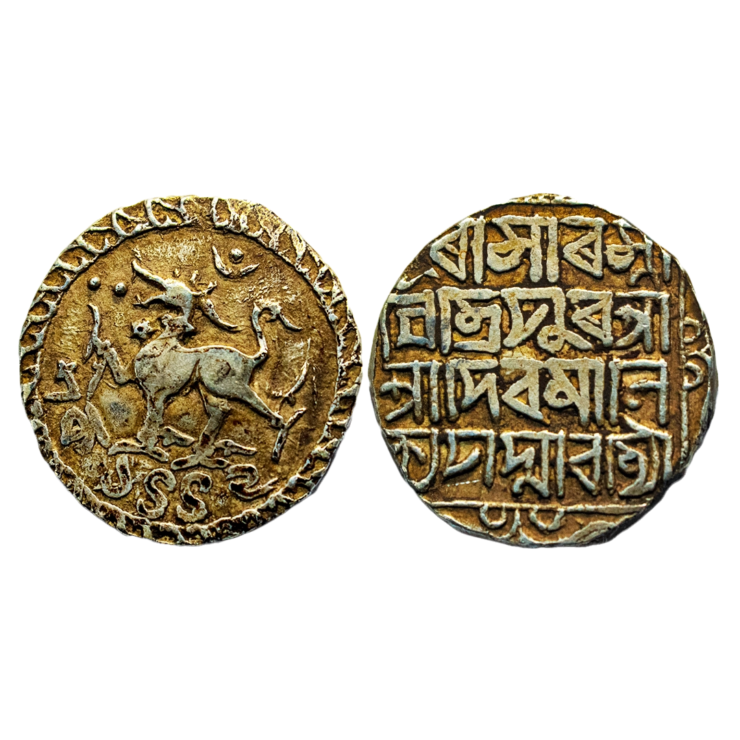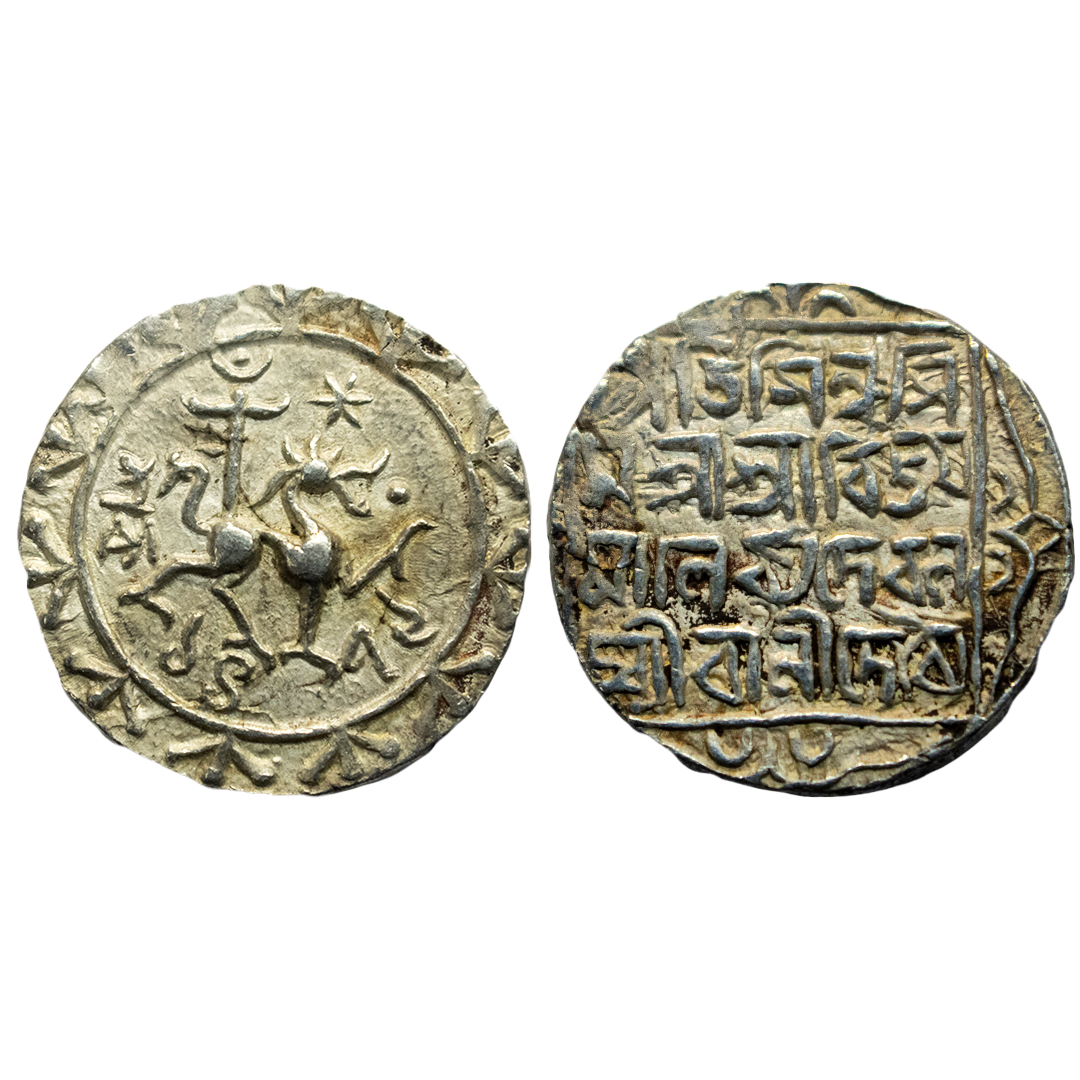 Dhurasara Snayi Type Silver Tanka of Deva Manikya citing Queen Padmavati, 10.65g, Saka 1449, Obverse: Lion facing left, crescent and bead above, two beads by lion's mouth, date below, all within a circle and fin-like border. Reverse: “Dhurasara Sna/yi Tripura Sri/ Sri Deva Mani/kya Padmavatyau” within square and border (R&B 78). Very Fine, Exceedingly Rare