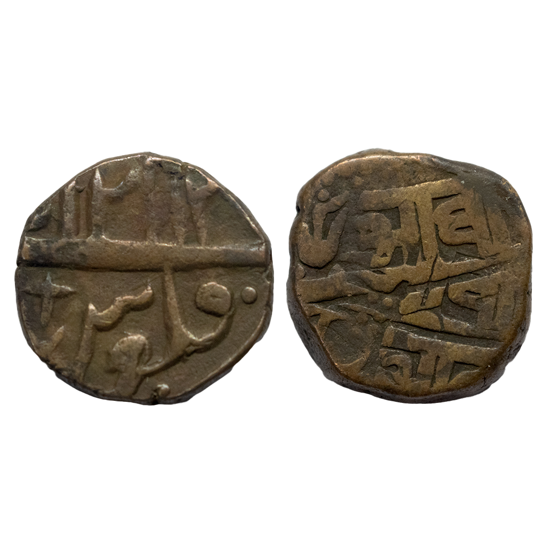 Indian Princely States, Indore State, INO Shah Alam II (AH 1174-1221, 1759-1806 AD), Copper 1/2 Anna, 16.19 gms, Malharnagar Mint, Obv. Nandi Bull reclining in front of Shiva Linga, Rev. denomination inscribed in Nagari adjacent to a Bilva leaf, KM # 68, Double Struck on reverse, very fine, scarce.