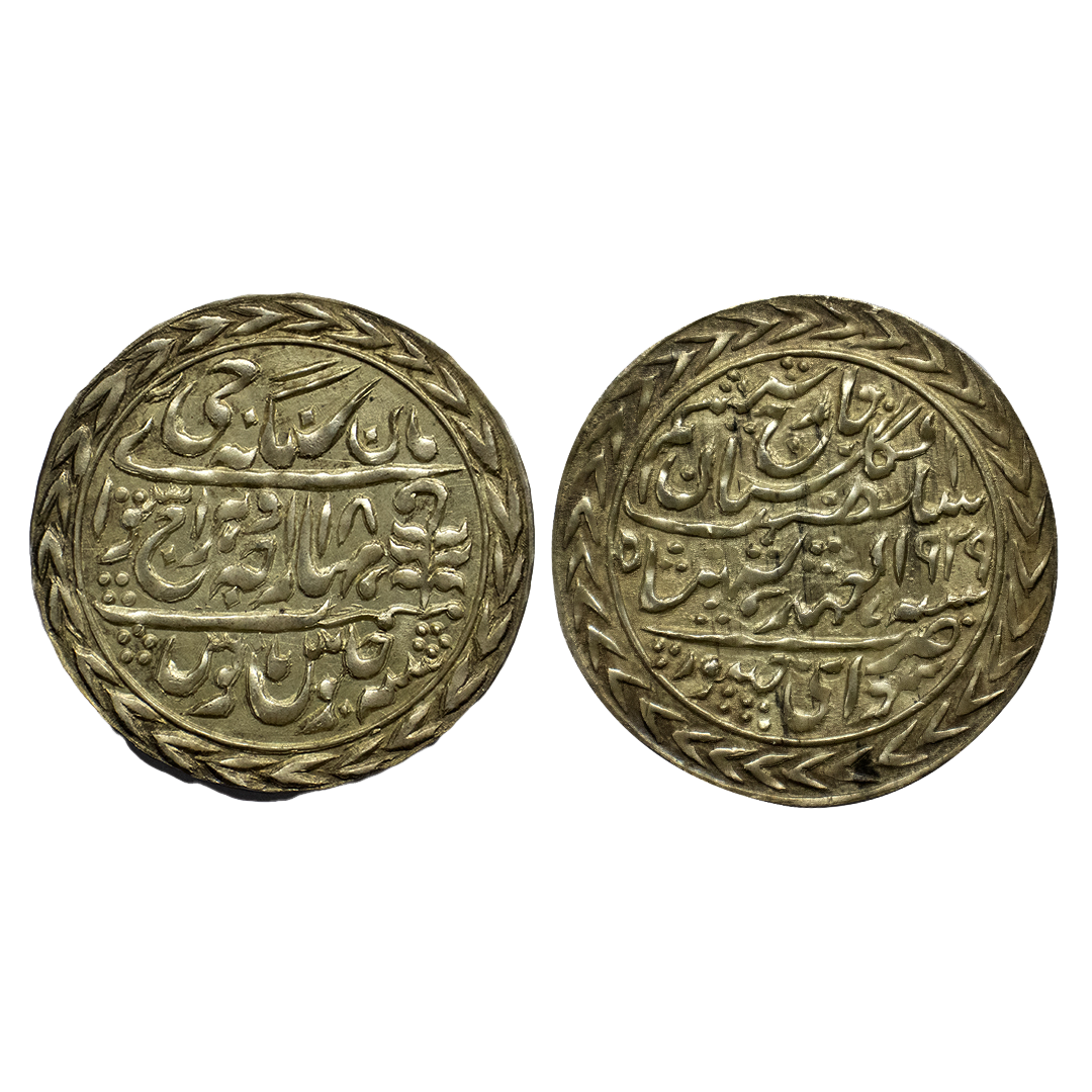 Indian Princely States, Indore State, INO Shah Alam II (AH 1174-1221, 1759-1806 AD), Copper 1/2 Anna, 16.19 gms, Malharnagar Mint, Obv. Nandi Bull reclining in front of Shiva Linga, Rev. denomination inscribed in Nagari adjacent to a Bilva leaf, KM # 68, Double Struck on reverse, very fine, scarce.