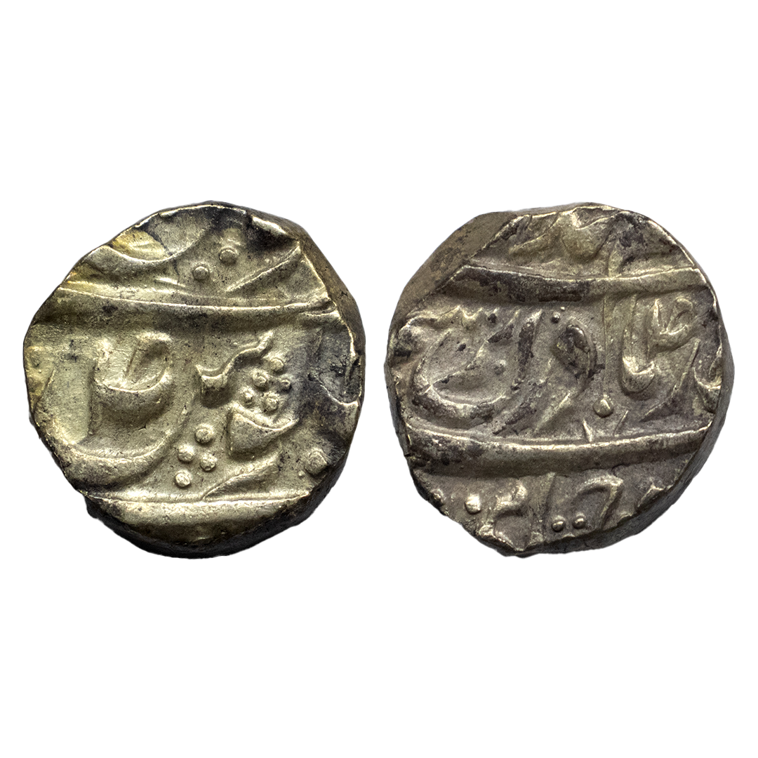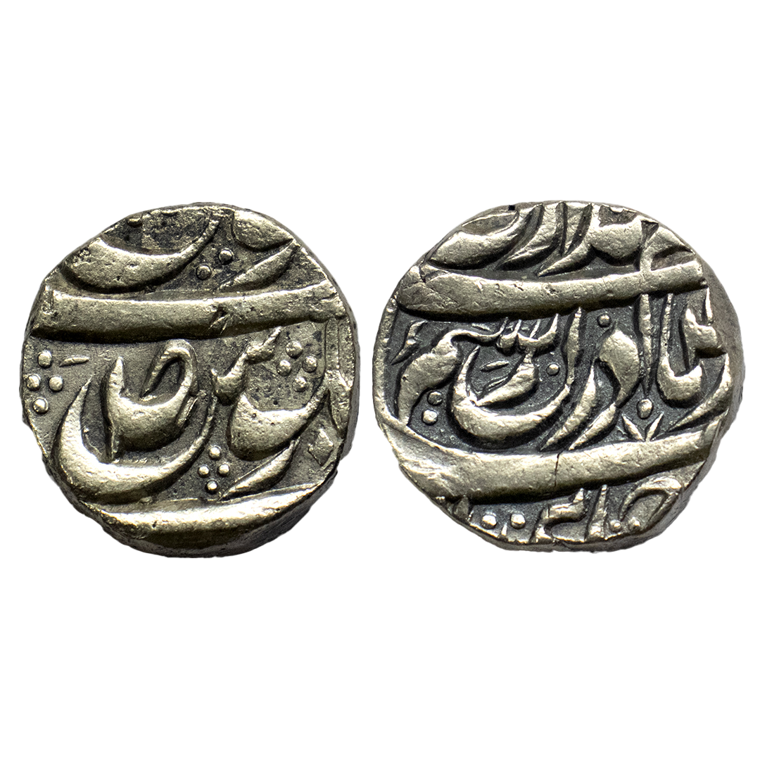 Indian Princely States, Jodhpur State, Takhat Singh (AH 1259-1290, 1843-1873 AD), INO Victoria, Silver Rupee, 11.34 gms, Pali Mint, Obv: Persian legend "zar-o-sim ra sikka zad Takht Singh, ba ahd queen shah-e-hind-o-farang", Rev: Nagari legend " Sri Mataji" with a sword & jhar symbol and the Persian legend "zarb Pali Marwad" at the bottom, KM # 67, broad flan, very fine, rare in this flan size.