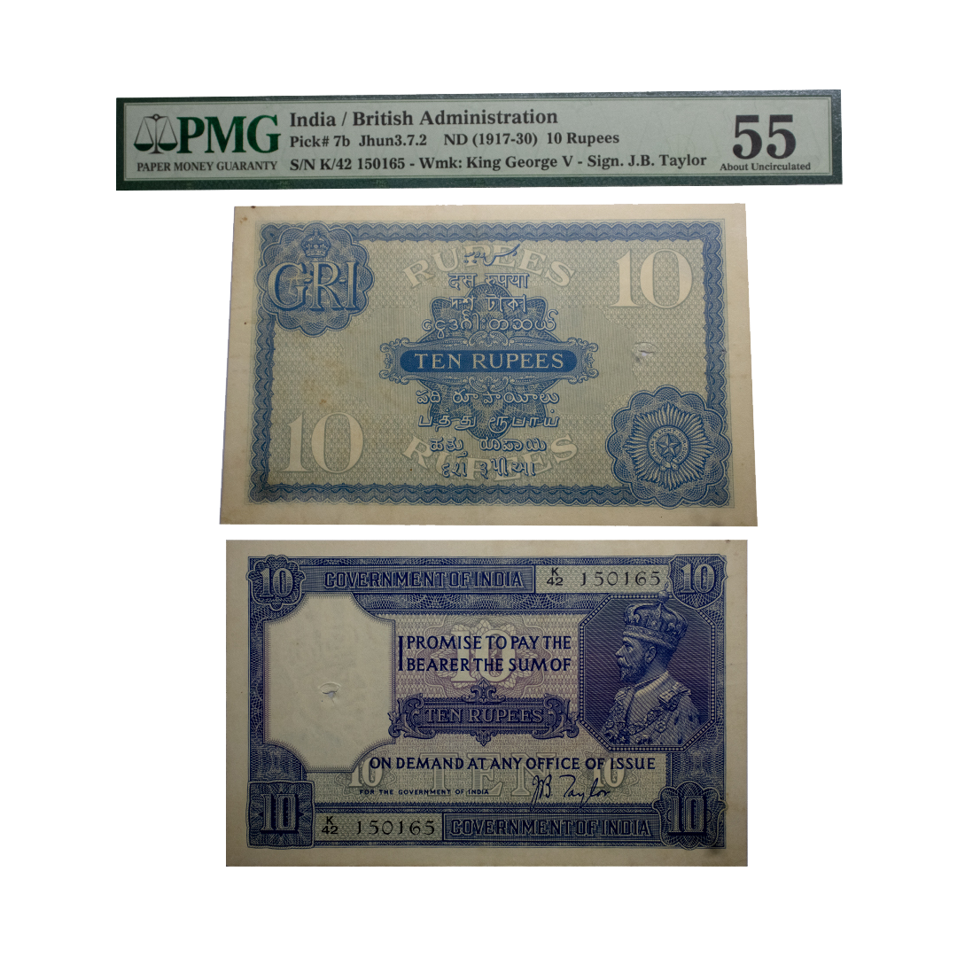 Government of India, George V, Uniface, 10 rupees, 4th issue, Red underprint, Universalised circle, dated 31 October 1919, signed by M.M.S. Gubbay, serial no.: BE7 80794, four serial numbers on all corners, J&R 2A.2.4.1, fold marks. Very fine, Very rare.
