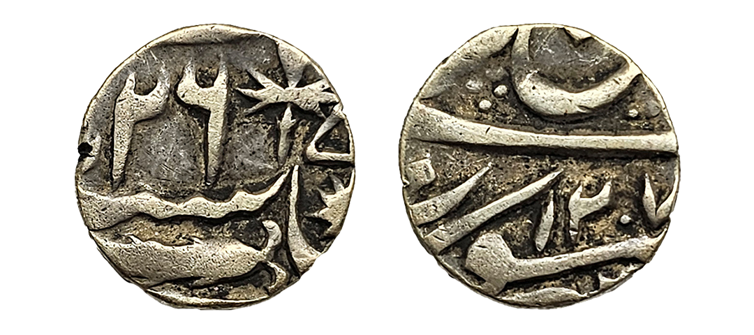 Princely States, Awadh, Ghazi-ud-din Haidar as King (AH 1234-1243 / 1819-1827 AD), Silver Rupee, 10.98gms, Dar-ul-Sultanate Lakhnau Suba Awadh, AH 1236, RY 2, Mint variety II, On obv. Crown flanked by rampant lions with holding flag. (KM # 165.2).