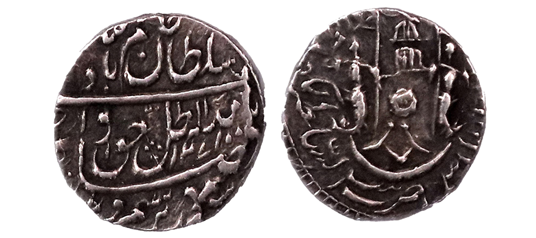 Princely States, Awadh, Ghazi-ud-din Haidar as King (AH 1234-1243 / 1819-1827 AD), Silver Rupee, 10.98gms, Dar-ul-Sultanate Lakhnau Suba Awadh, AH 1236, RY 2, Mint variety II, On obv. Crown flanked by rampant lions with holding flag. (KM # 165.2).