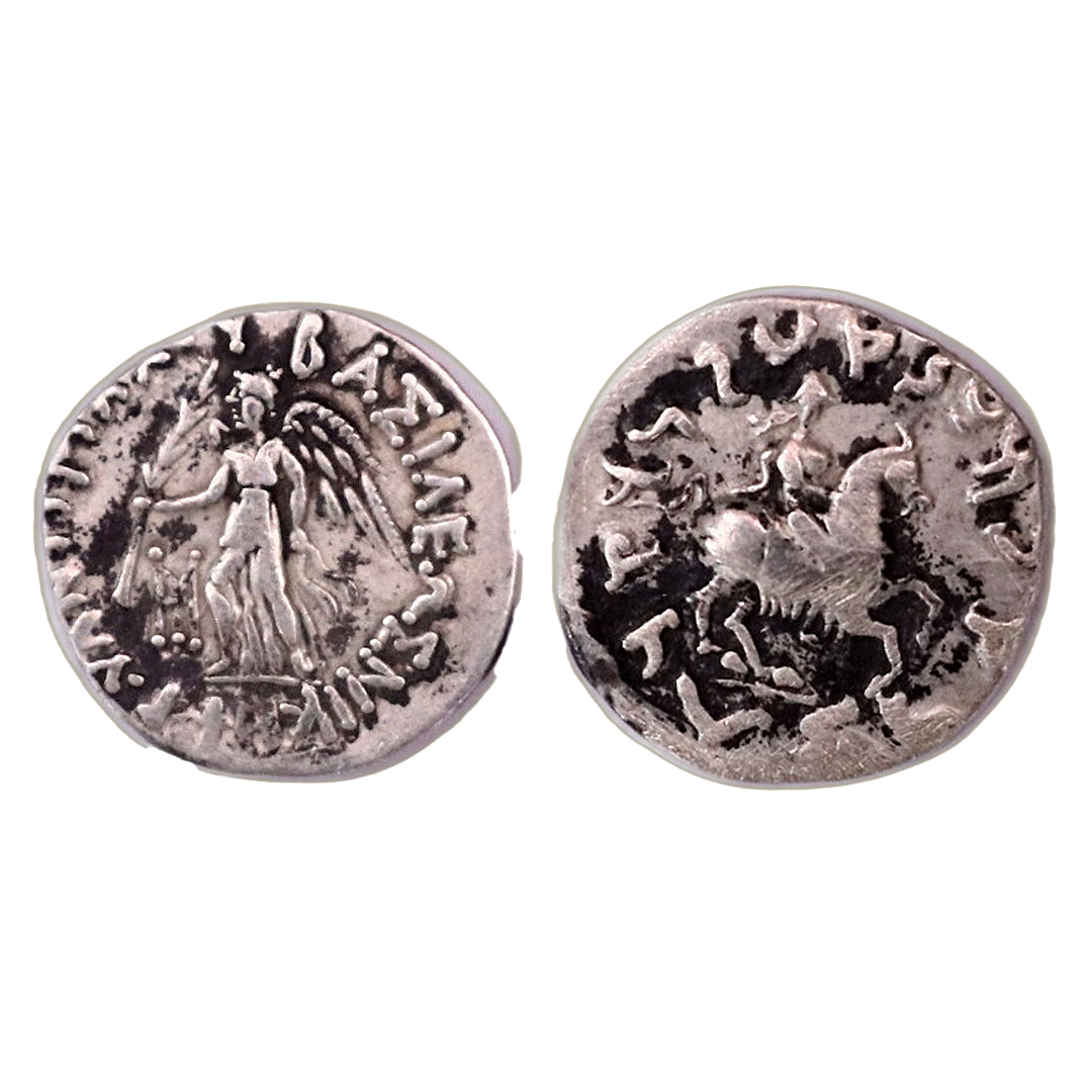 Ancient India, Early Kushana, The Da Yuezhi From Bactria, Sapadbizes (c. 100 BC), Silver Hemidrachm, 1.43gms, OBV: Bust of King with wearing crested helmet facing to right side aroud Greek inscription, REV: Lion standing facing to right side above crescent with both side Greek inscription NANAIA. (Jongeward, Cribb & Donovan # 1-4).