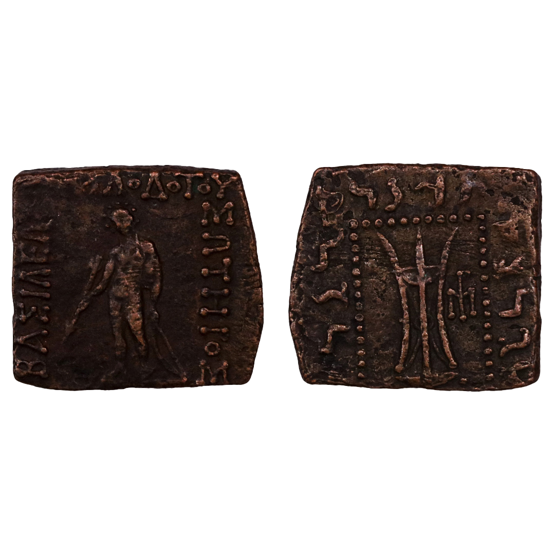Indo-Greek, Apollodotus I (c. 180-160 BC), Square Copper Quadruple Unit, 8.32g, OBV: Apollo standing facing, with quiver over shoulder, holding arrow in right hand and left hand resting on grounded bow with Greek legend, REV: Tripod with Kharoshthi legend. (Bopearachchi & Rahman # 206). Fine.