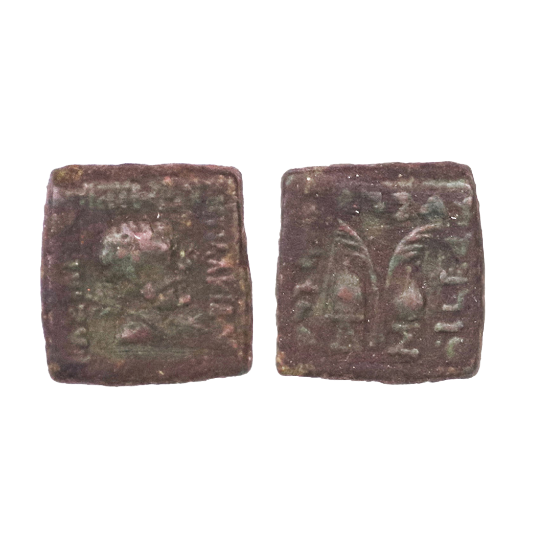 Indo-Greek, Apollodotus I (c. 180-160 BC), Square Copper Quadruple Unit, 8.78gms, OBV: Apollo standing facing, with quiver over shoulder, holding arrow in right hand and left hand resting on grounded bow with Greek legend, REV: Tripod with Kharoshthi legend. (Bopearachchi & Rahman # 206).
