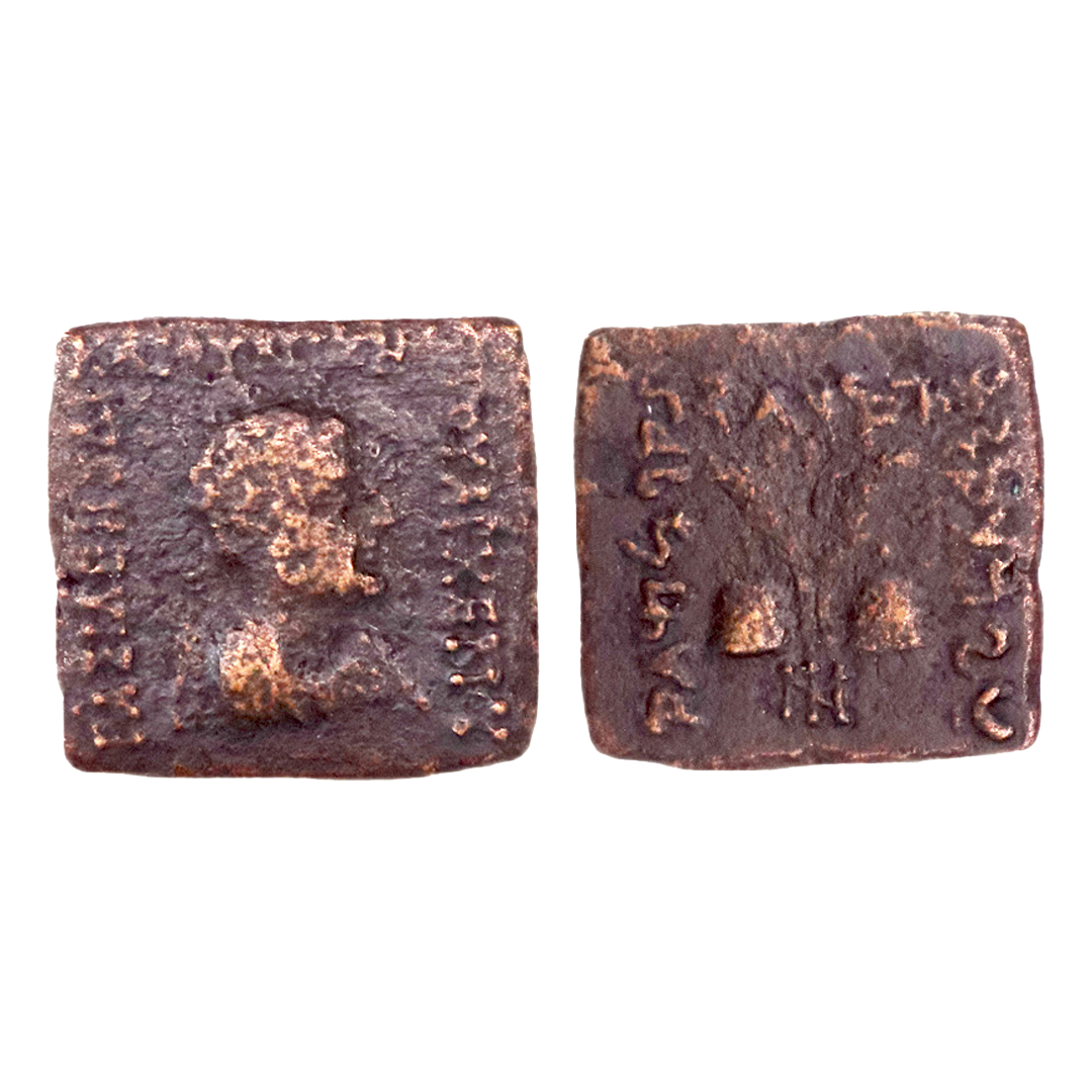 Indo-Greek, Apollodotus I (c. 180-160 BC), Square Copper Quadruple Unit, 8.78gms, OBV: Apollo standing facing, with quiver over shoulder, holding arrow in right hand and left hand resting on grounded bow with Greek legend, REV: Tripod with Kharoshthi legend. (Bopearachchi & Rahman # 206).